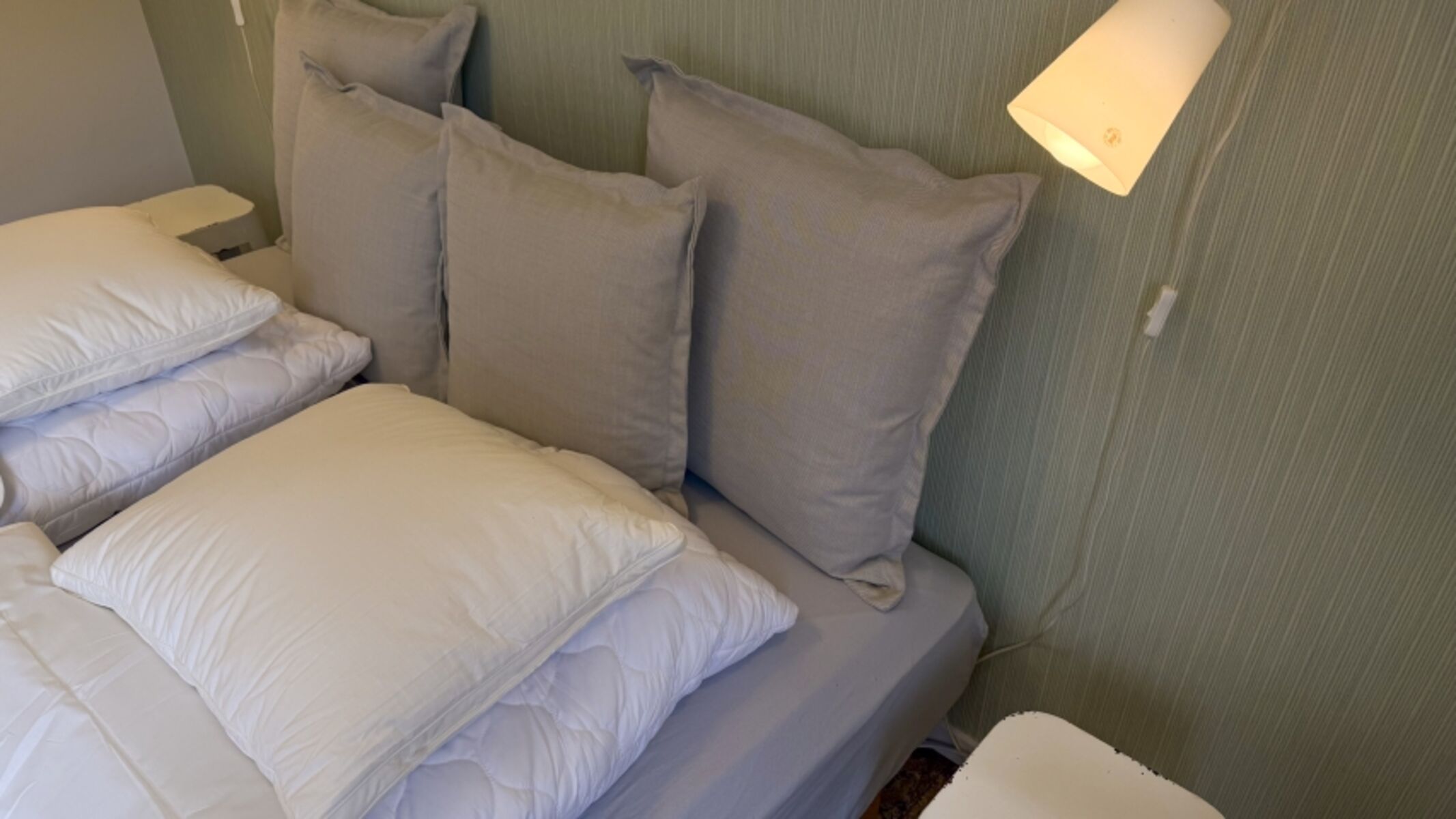 Kopfkissen und Bettdecken sind vorhanden. Das Doppelbett besteht aus zwei Einzelbetten, die auf Wunsch getrennt werden können. Doppelbett 1,60 x 2,00m, Leselampe am Bett