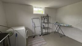 Es führen mehrere Stufen zur Haustür hinauf, ebenso von der Veranda in den Garten hinunter. Alle genannten Räume befinden sich auf einer Ebene im Erdgeschoss. Hinter einer Tür im Flur führt eine Treppe in den Keller. Dort stehen Waschmaschine und Gefrierschrank.