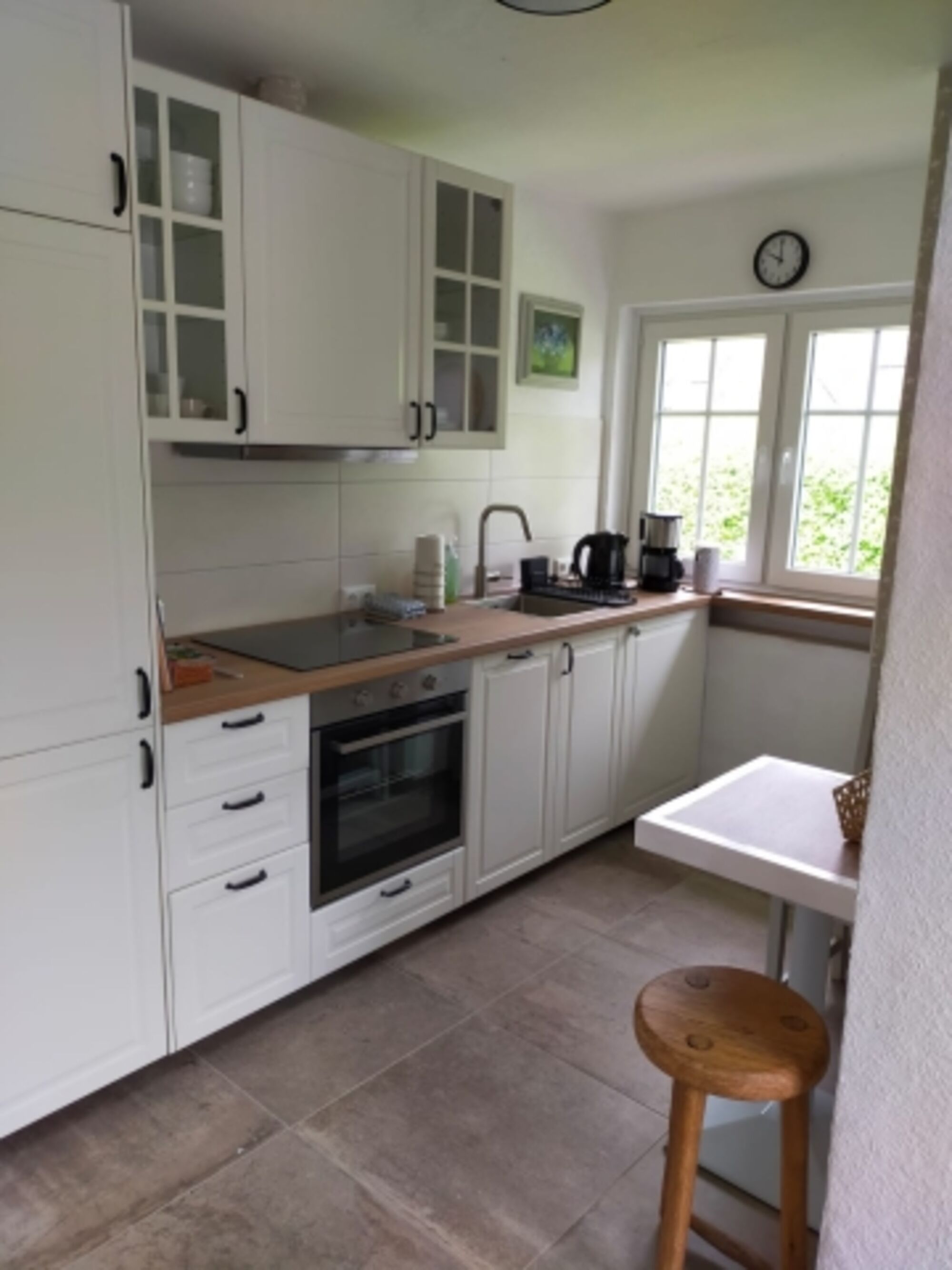 Cerankochfeld, Induktionsherd, Dunstabzugshaube, Kühlschrank mit Gefrierfach, Gefrierschrank, Tassimo-Kaffeautomat, Eierkocher, Mixer, Korkenzieher / Flaschenöffner, Gewürze (Salz, Pfeffer, Zucker), Öl / Essig, Geschirrhandtücher, Mülltüten, Essplatz in der Küche