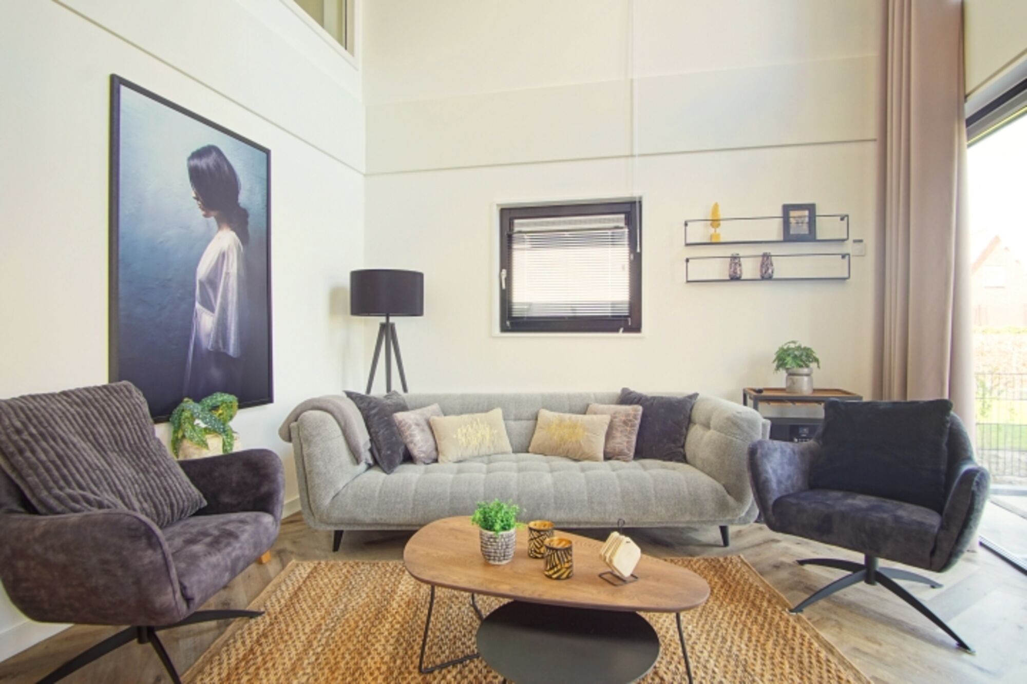 * Ein lichtdurchflutetes Wohnzimmer mit atemberaubendem Meerblick durch 5 Meter hohe Panoramafenster, gemütlicher Sitzecke, 65" OLED TV, smartem Soundsystem und einem stimmungsvollen Showkamin