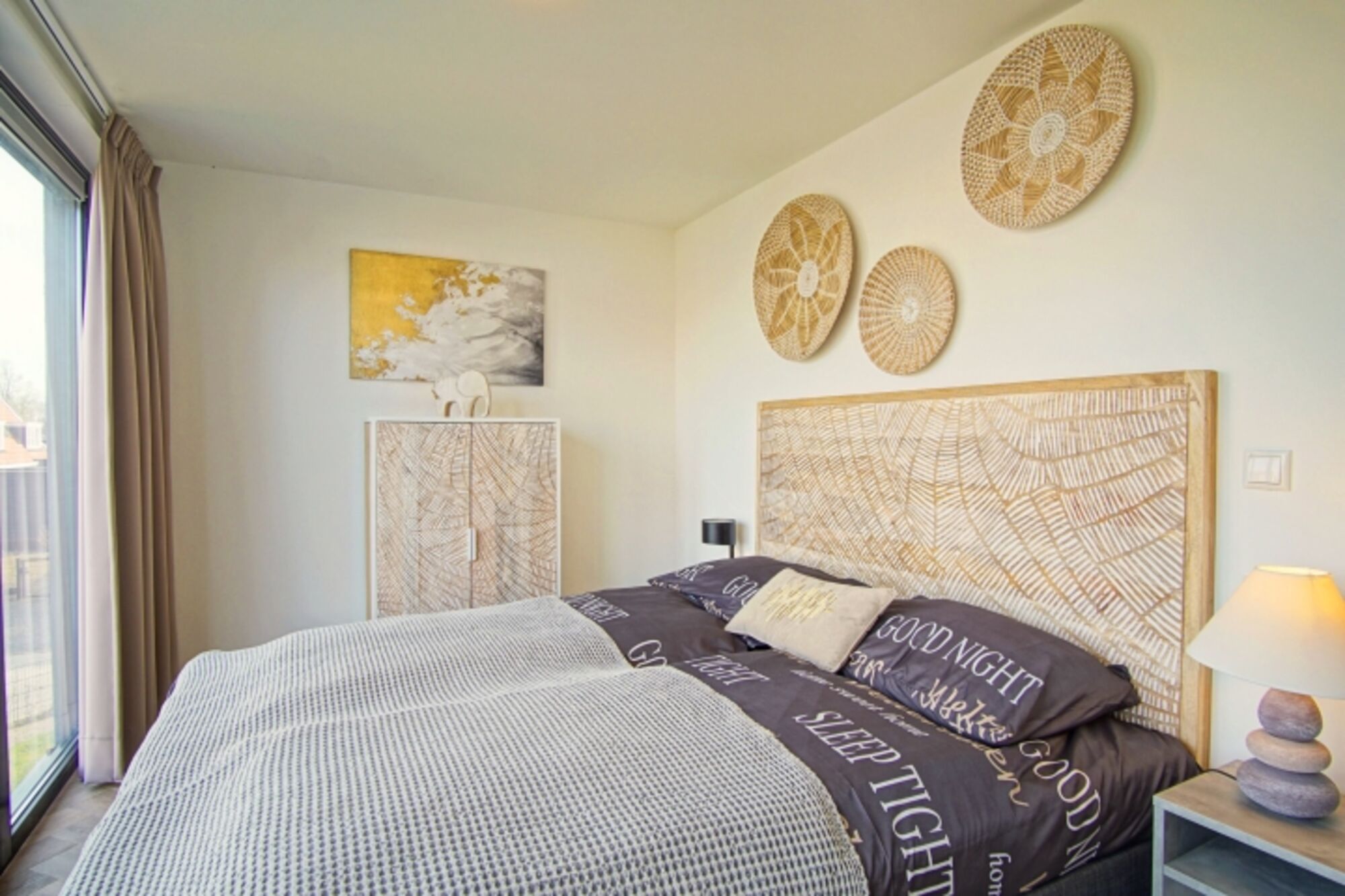 * Drei komfortable Schlafzimmer, jeweils mit großzügigem Doppelbett, Nachttischen, Einbauschrank und 55" OLED TV. Eines der Schlafzimmer verwöhnt Sie zusätzlich mit einem einzigartigen Meerblick.