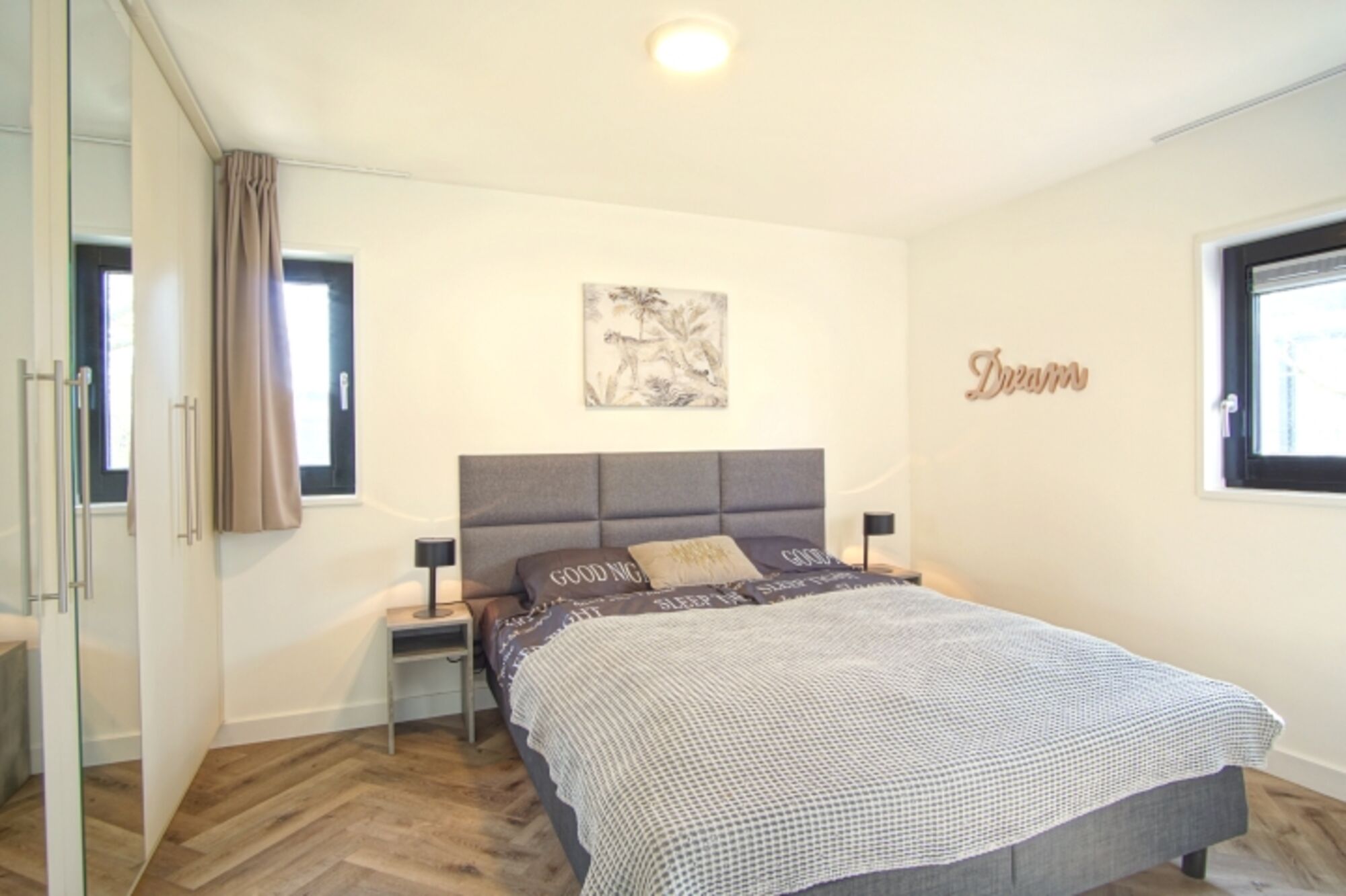 Doppelbett, 55“ OLED Luxus-TV, großer Kleiderschrank. Gemütlichkeit schlechthin Doppelbett 1,80 x 2,00m, Spiegel, Fliegengitter