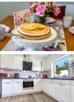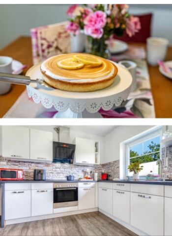 4-Platten Herd, Cerankochfeld, Dunstabzugshaube, Kühlschrank mit Gefrierfach, Gefrierschrank, Nespresso-Automat, Eierkocher, Mixer, Korkenzieher / Flaschenöffner, Gewürze (Salz, Pfeffer, Zucker), Öl / Essig, Geschirrhandtücher, Mülltüten, Essplatz in der Küche
