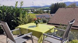 Auf der wunderschönen teilweise überdachten ca. 20 qm großen Südterrasse sind Tisch, Stühle, Liegestühle, Sonnenschirm und kleiner Grill vorhanden. Es besteht ein Sichtschutz zu den Nachbarn. Die Aussicht von der Terrasse ist grandios!