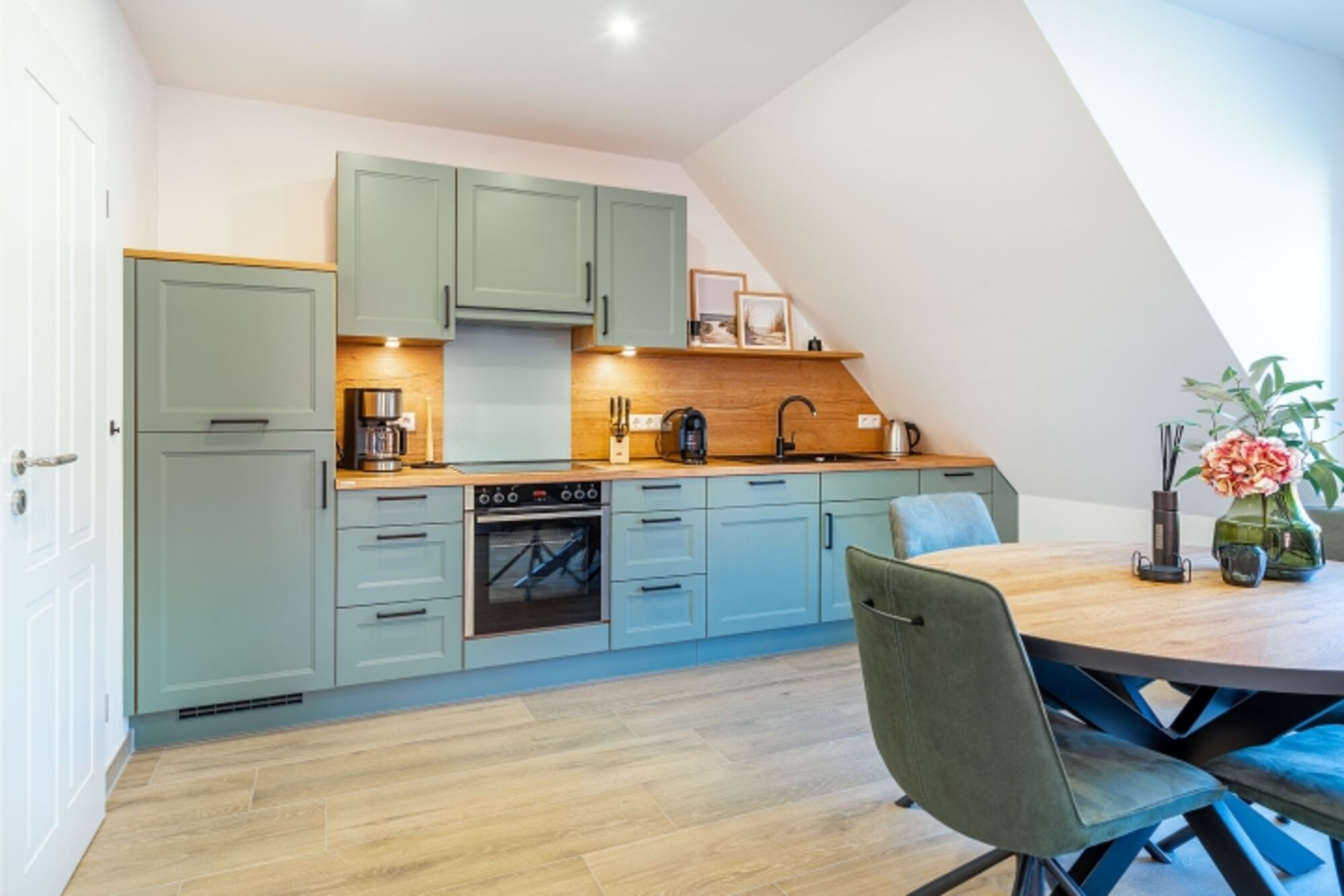 Cerankochfeld, Dunstabzugshaube, Kühlschrank mit Gefrierfach, Gefrierschrank, Mixer, Korkenzieher / Flaschenöffner, Essplatz in der Küche