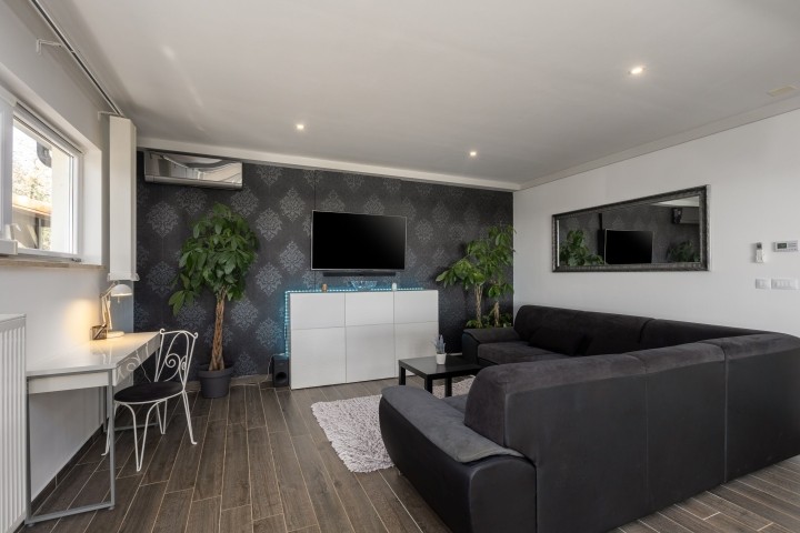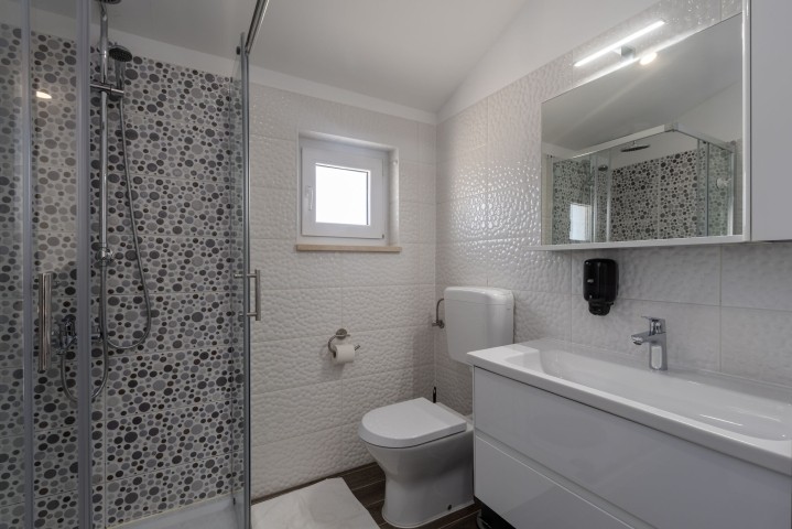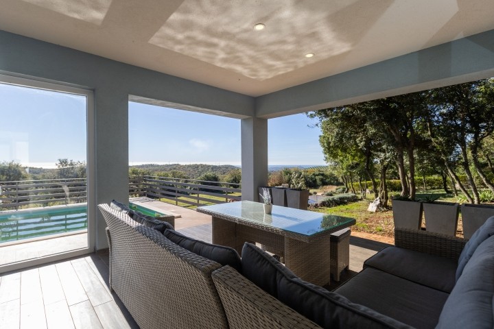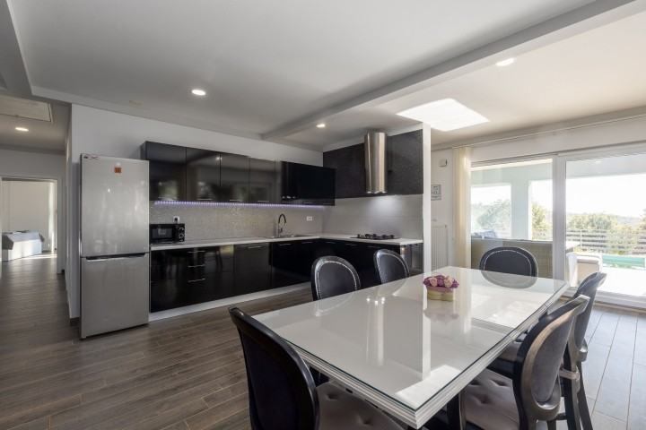 Villa Selagodi – Eine Oase der Ruhe mit Blick auf Rovinj und die Adria. Inmitten unberührter Natur, nur 1,3 Kilometer vom malerischen Dorf Rovinj und 6 Kilometer vom Stadtzentrum entfernt, bietet die Villa Selagodi die perfekte Kombination aus Luxus, Ruhe und authentischem istrischem Flair. Auf 180 m² Wohnfläche ist diese elegante Villa wie geschaffen für vollkommene Entspannung und Genuss – ideal für Familien, Freunde oder Paare, die dem Alltag entfliehen und gleichzeitig eines der schönsten Reiseziele an der Adria erkunden möchten. Das Interieur der Villa Selagodi besticht durch Licht, Großzügigkeit und schlichte Eleganz. Drei komfortable Schlafzimmer, liebevoll mit viel Liebe zum Detail eingerichtet, bieten maximalen Komfort und erholsamen Schlaf. Drei moderne Badezimmer mit hochwertigen Materialien und moderner Sanitärausstattung gewährleisten Privatsphäre und Funktionalität. Das Herzstück der Villa bildet ein geräumiges, offenes Wohnzimmer mit angrenzendem Esszimmer und voll ausgestatteter Küche. Obwohl die Küche keinen Backofen besitzt, ist sie ansonsten mit allem ausgestattet, was Sie für die Zubereitung köstlicher Mahlzeiten benötigen – von modernen Küchengeräten bis hin zu hochwertigem Geschirr. Das Wohnzimmer bietet einen wunderschönen Blick ins Freie und verstärkt so das Gefühl der Verbundenheit mit der Natur. Auf der Terrasse befindet sich ein 32 m² großer Swimmingpool, der sich perfekt zur Erfrischung an warmen Sommertagen eignet. Neben dem Pool laden bequeme Liegen, Sonnenschirme und ein ruhiger Bereich zum Entspannen ein – ideal zum Sonnenbaden, Lesen oder um den Abend bei einem Glas Wein ausklingen zu lassen. Ein überdachter Bereich mit Esstisch im Freien lädt zu gemütlichen Familienessen im Freien ein. Das Besondere an der Villa Selagodi ist der beeindruckende, 13.000 m² große Garten – eine wahre private Oase, umgeben von Grün, Olivenbäumen und mediterranen Pflanzen. Hier genießen Sie absolute Ruhe und Privatsphäre, lauschen dem Zwitschern der Vögel und lassen den atemberaubenden Panoramablick auf sich wirken. Von der Terrasse aus haben Sie einen herrlichen Blick auf das Meer und Rovinj, eine der romantischsten Städte am Mittelmeer, deren Glockenturm sich deutlich am Horizont abzeichnet. Die Villa Selagodi vereint auf perfekte Weise den rustikalen Charme der istrischen Natur mit modernem Komfort. Obwohl sie von viel Grün umgeben ist und absolute Privatsphäre bietet, ist alles bequem erreichbar: Nur wenige Autominuten trennen Sie von den malerischen Stränden von Rovinj, erstklassigen Restaurants, kulturellen Sehenswürdigkeiten und zahlreichen Aktivitäten wie Radfahren, Wandern, Bootsausflügen oder Weintouren. Ob Sie einen Ort für einen ruhigen Familienurlaub, eine romantische Auszeit zu zweit oder einen Ausgangspunkt zur Erkundung Istriens suchen – die Villa Selagodi bietet alles, was Sie sich wünschen: Komfort, Eleganz und einen spektakulären Ausblick, der Ihnen noch lange in Erinnerung bleiben wird.