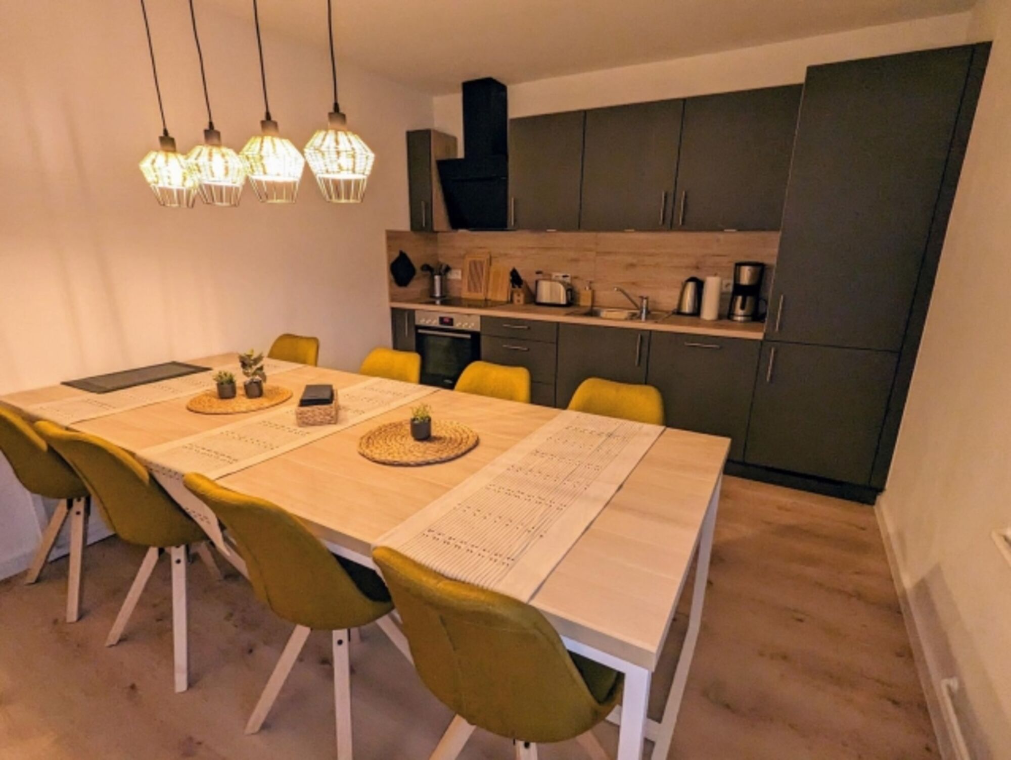 Voll ausgestattete Küche mit allem was man braucht um sich ein schönes Frühstück oder die warme Mahlzeit zuzubereiten. Der Küchenbereich ist offen gestaltet zum angrenzenden Wohnzimmer hin, der Essbereich ist für 8 Personen ausgelegt.