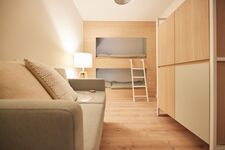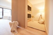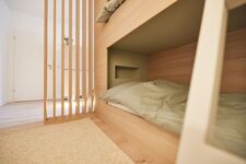 In diesem Schlafzimmer befindet sich eine kleine Besonderheit. Neben dem Doppelbett befindet sich hier ein sehr stilvoll gestaltetes Etagenbett in Form von Schlafkojen. Diese sind etwas abgetrennt durch einen Raumteiler. Auch hier haben Sie die Möglichkeit vom Bett aus noch ein wenig fernzusehen.