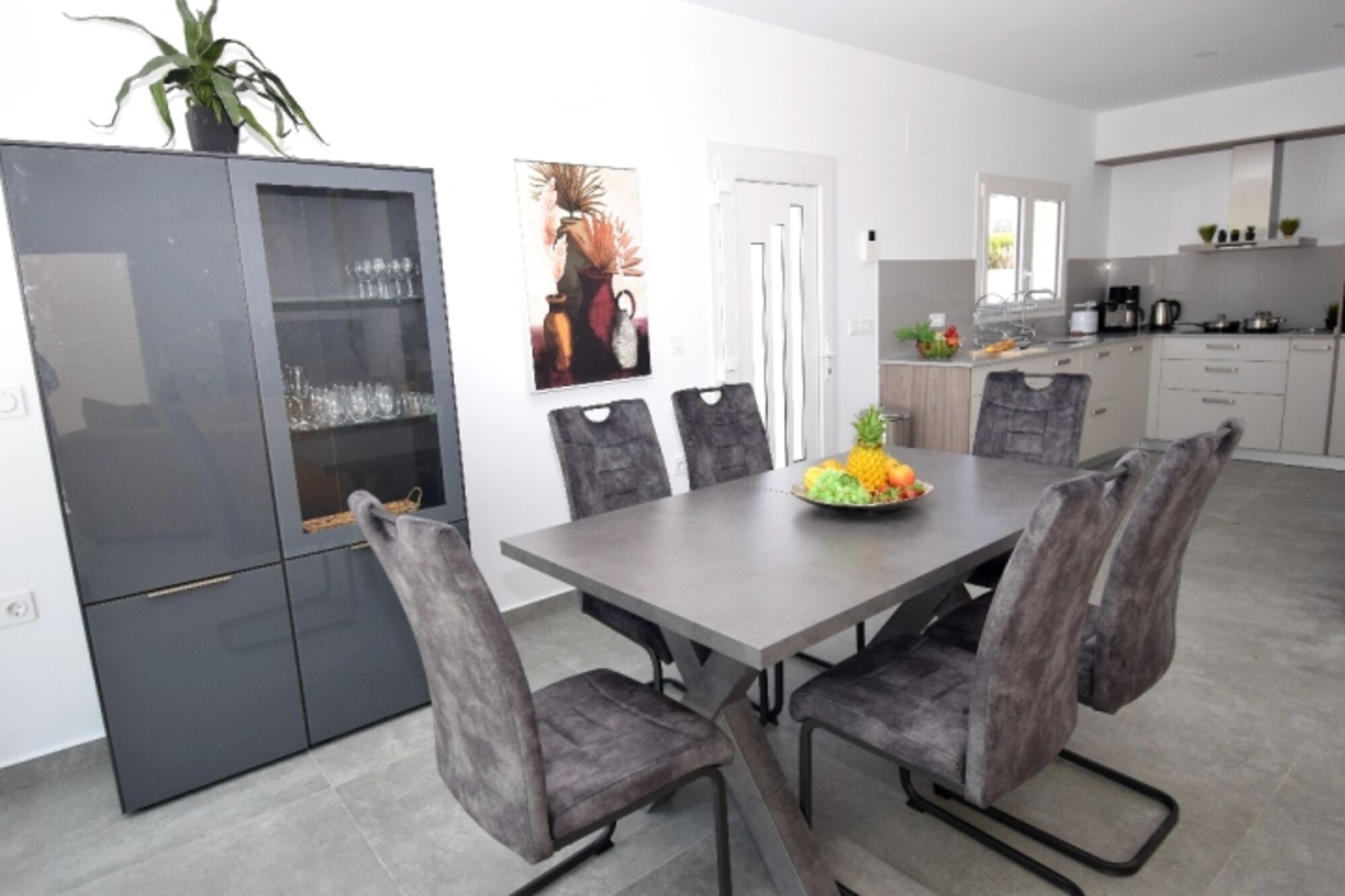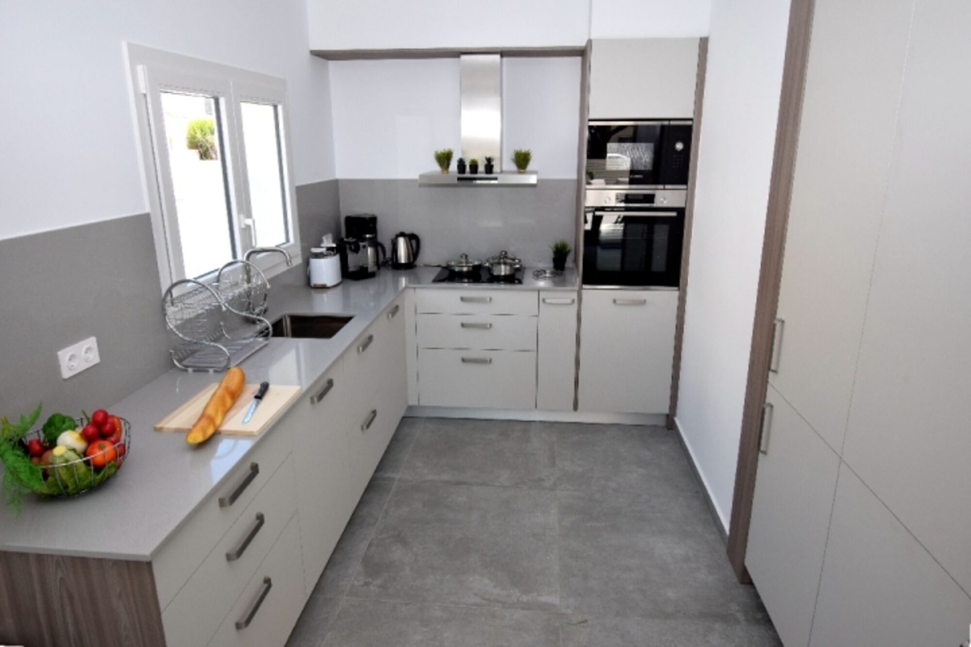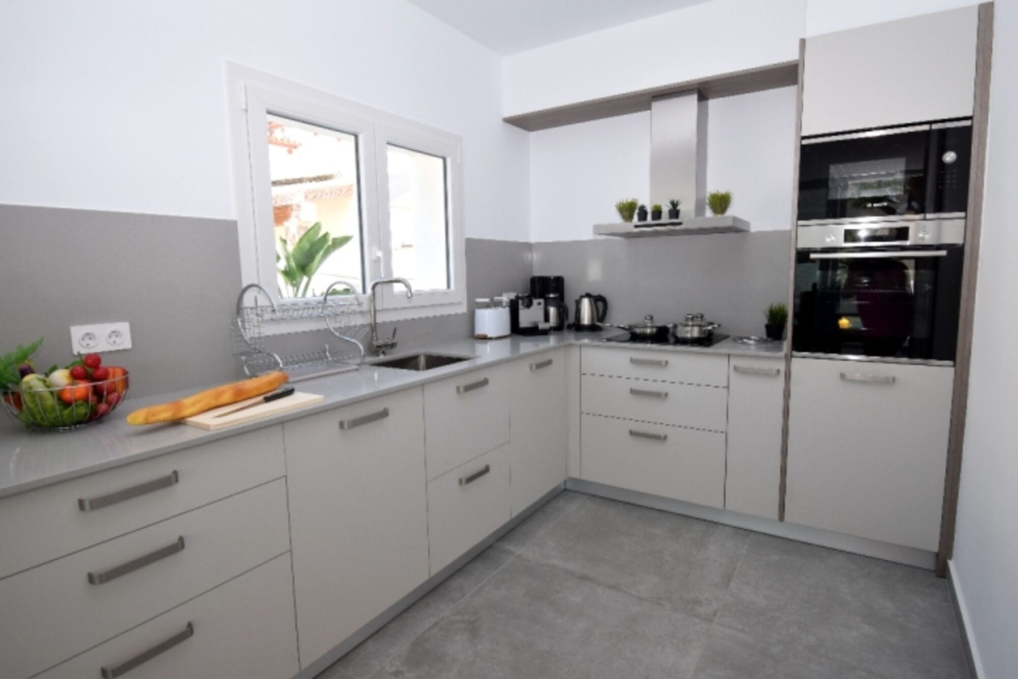 Cerankochfeld, Induktionsherd, Dunstabzugshaube, Kühlschrank mit Gefrierfach, Gefrierschrank, Nespresso-Automat, Korkenzieher / Flaschenöffner, Gewürze (Salz, Pfeffer, Zucker), Öl / Essig, Geschirrhandtücher, Mülltüten