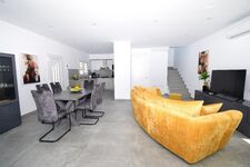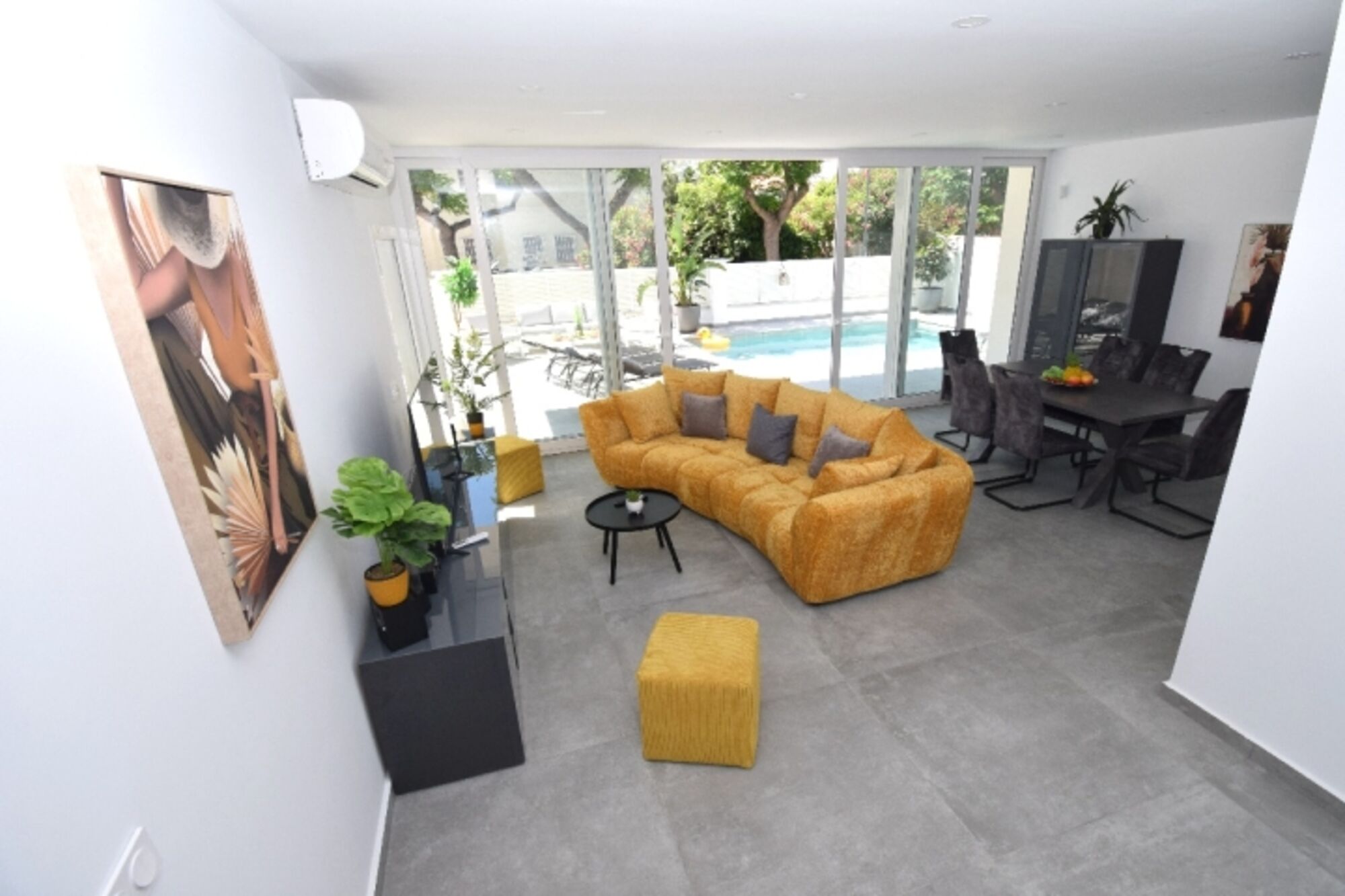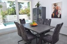 Wohnzimmer mit grosser Couchgarnitur, Klima, SAT-TV mit Flachbild-TV, Essbereich mit Tisch und Stühlen – alles mit Blick zum Pool. Stereo-Microanlage :Radio, Bluetooth, CD/MP3/USB