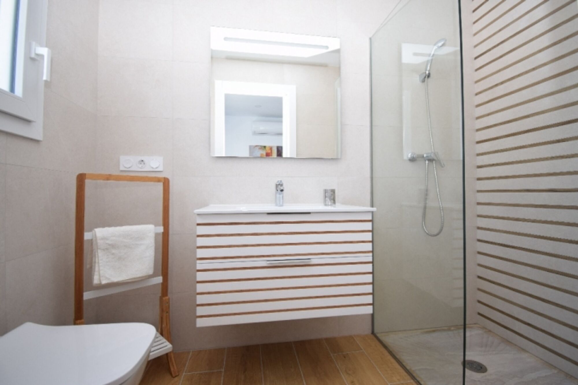 Bad en Suite mit ebenerdiger Dusche, Waschbecken und WC Waschbecken, Spiegel, Fenster im Bad