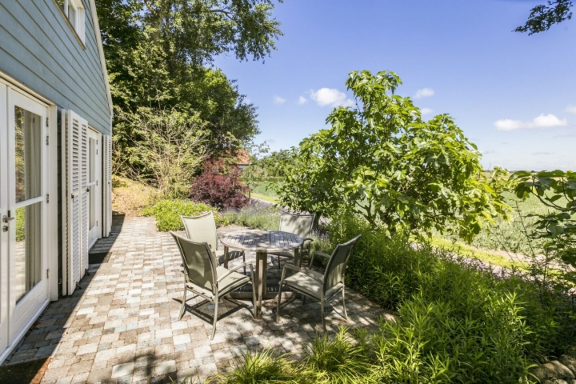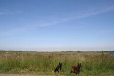 Wiesen und Felder direkt gegenüber des Hauses. Durch ein kleines Wäldchen gelangt man dann zum kilometerlangen Sandstrand und den Dünen.