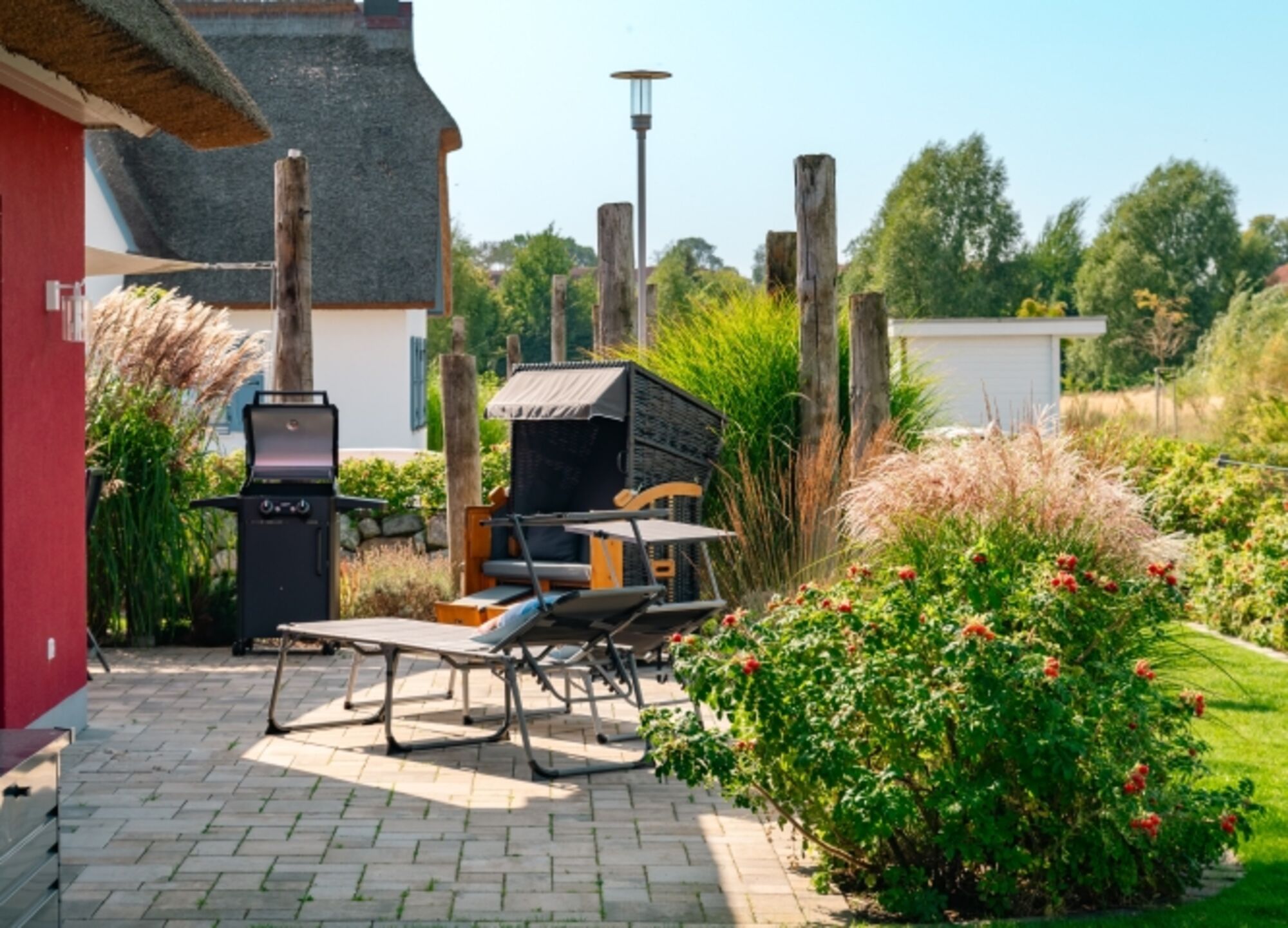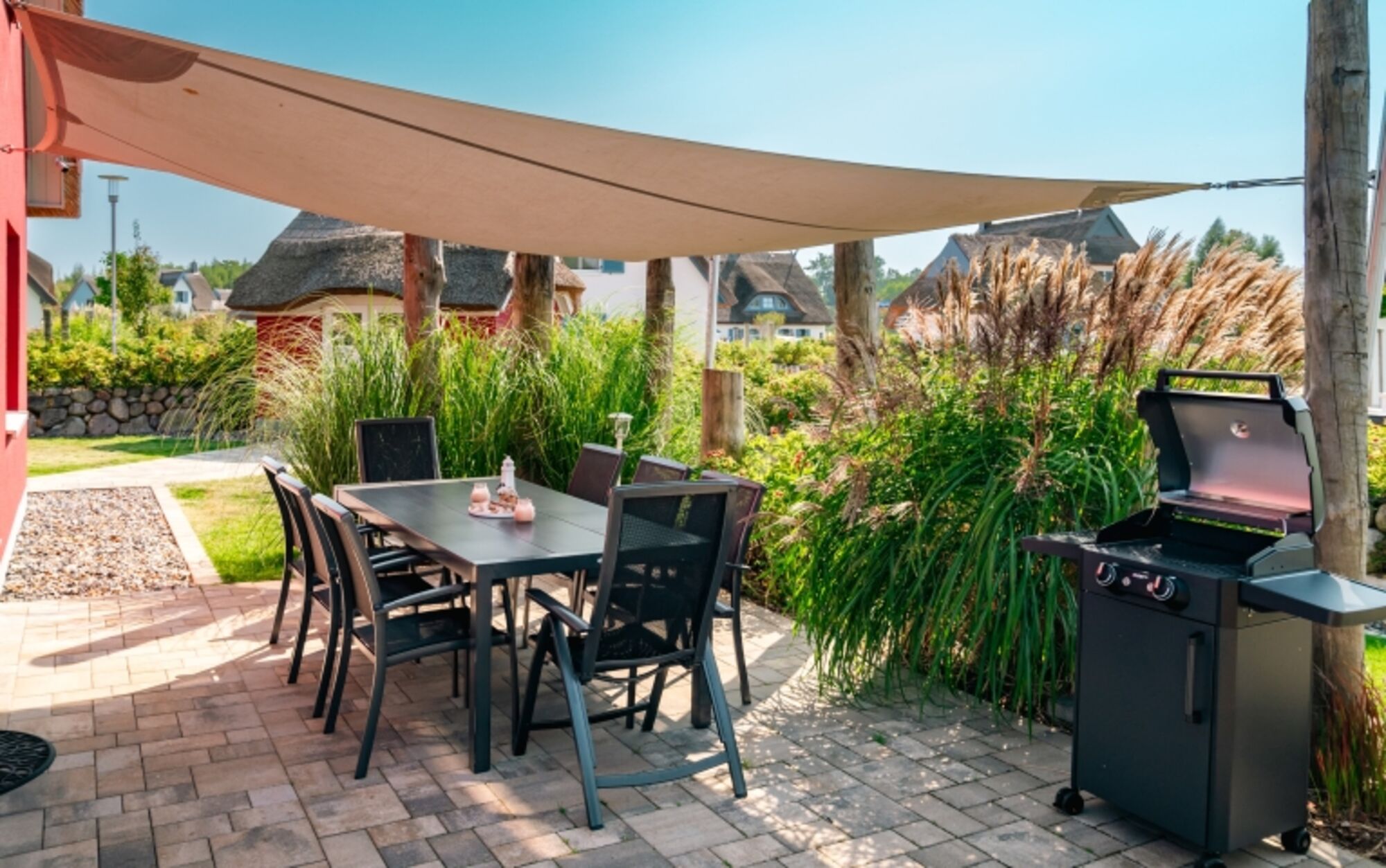 Große Terrasse mit Sonnensegel, Strandkorb, Sitzmöbeln, Sonnenliegen und Elektrogrill.