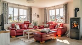 TV-Sat, SMART-TV, HDTV Flachbildschirm, Blu-Ray-Player, Bücher, Kaminofen, 3er-Sofa, Fliegengitter, TV-Magenta
