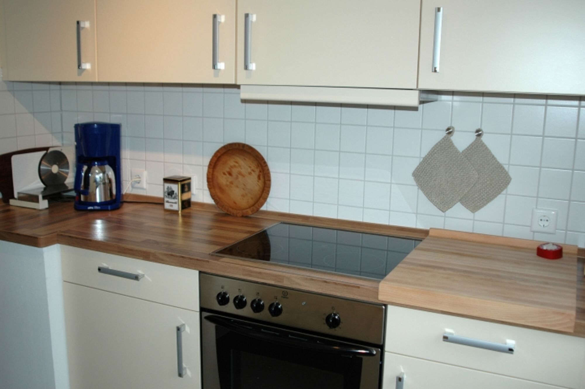 Cerankochfeld, Kühlschrank mit Gefrierfach, Senseo-Kaffeeautomat, Nespresso-Automat, Eierkocher, Küchenmaschine, Mixer, Elekt. Fruchtpresse, Gewürze (Salz, Pfeffer, Zucker), Öl / Essig, Geschirrhandtücher, Mülltüten