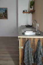 2-Platten Herd, Gewürze (Salz, Pfeffer, Zucker), Geschirrhandtücher, Mülltüten, Essplatz in der Küche