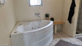 Badewanne mit Whirlpool, Waschbecken, Spiegel, Fenster im Bad