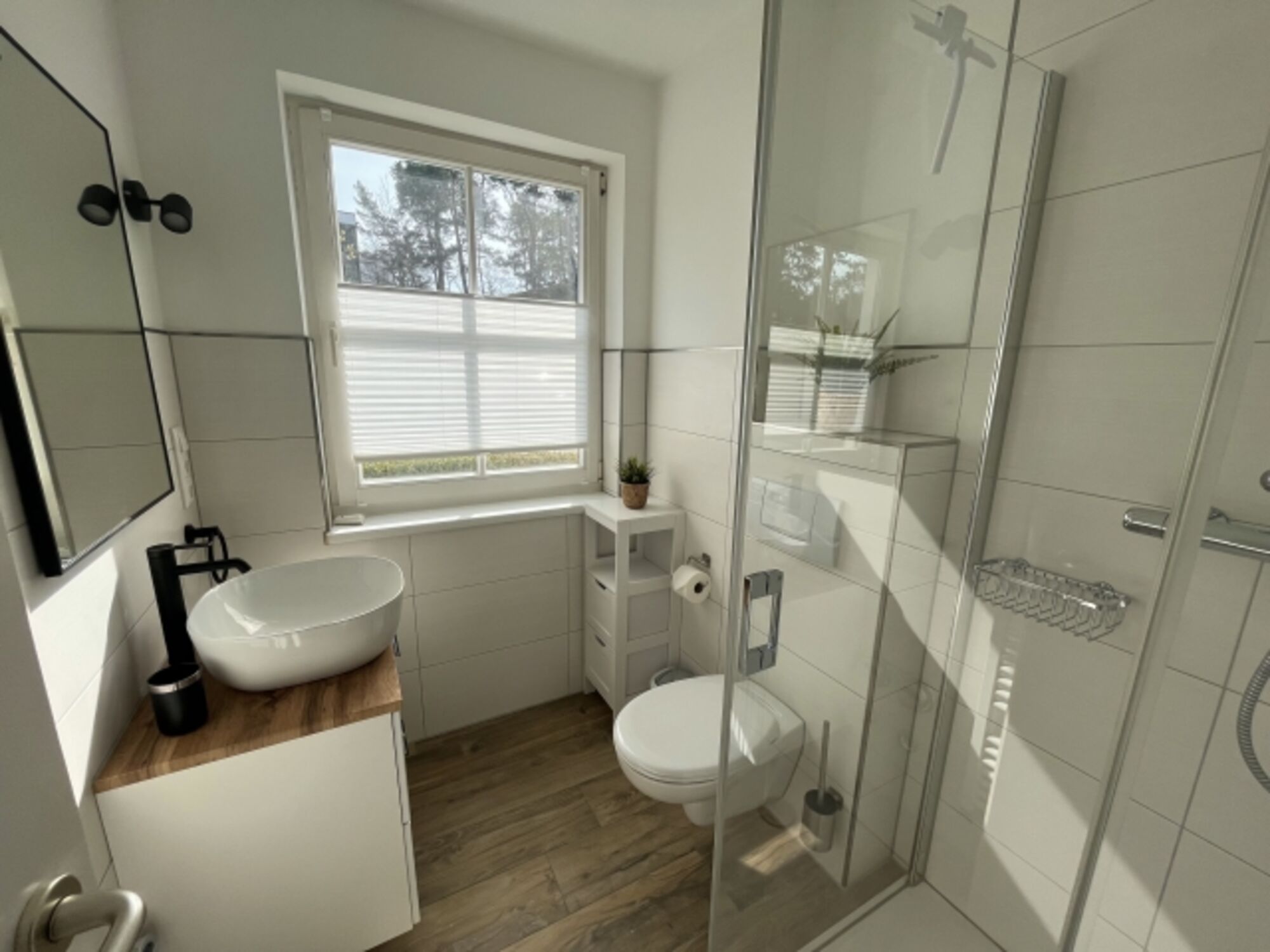 Die Wohnung wurde kürzlich erst komplett renoviert. Das moderne Badezimmer verfügt über ein Fenster, eine Fußbodenheizung und eine großzügige Glas-Duschkabine.