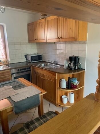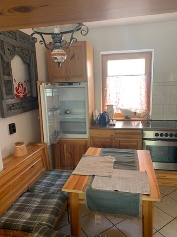 4-Platten Herd, Cerankochfeld, Kühlschrank mit Gefrierfach, Gefrierschrank, Korkenzieher / Flaschenöffner, Geschirrhandtücher, Mülltüten, Essplatz in der Küche