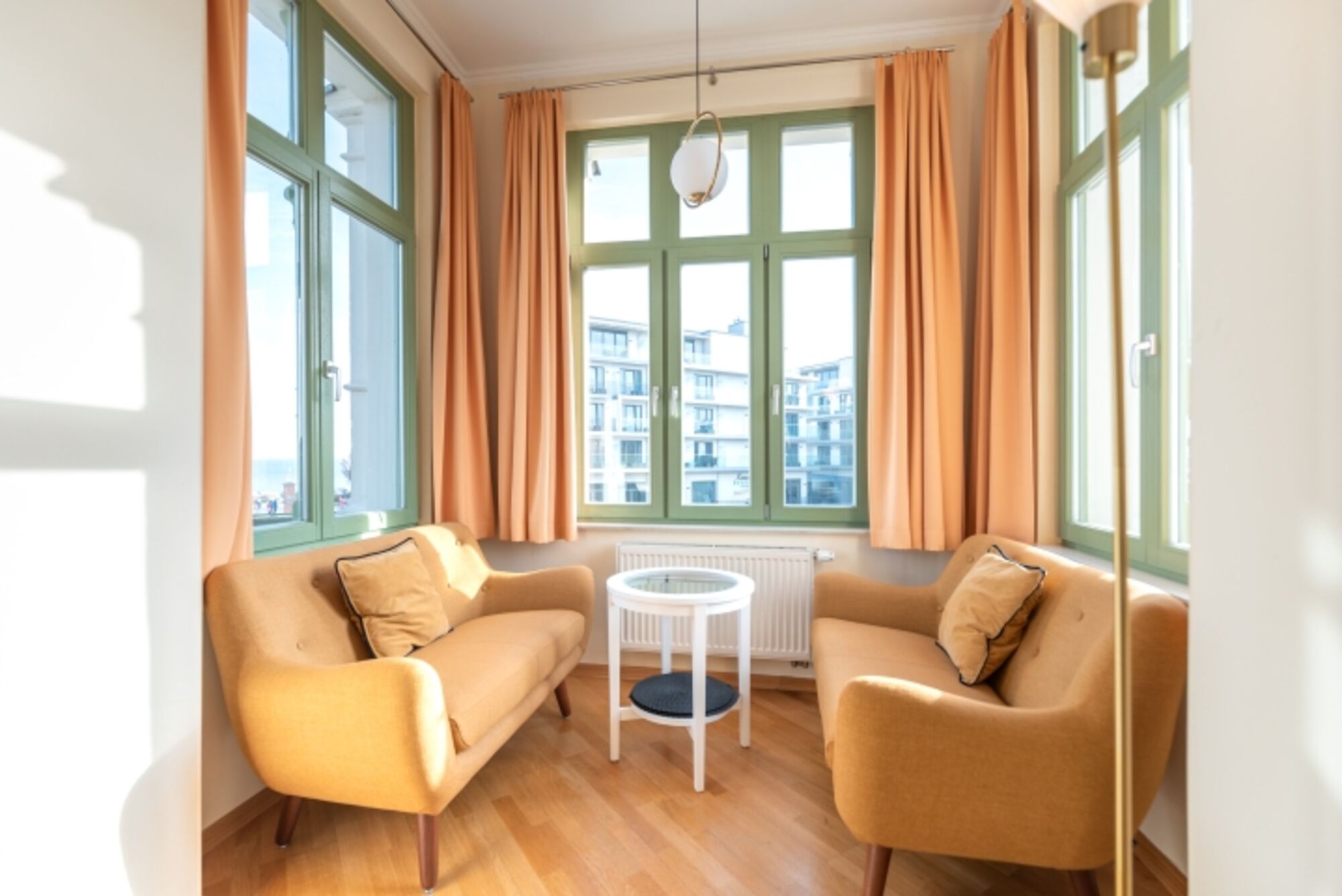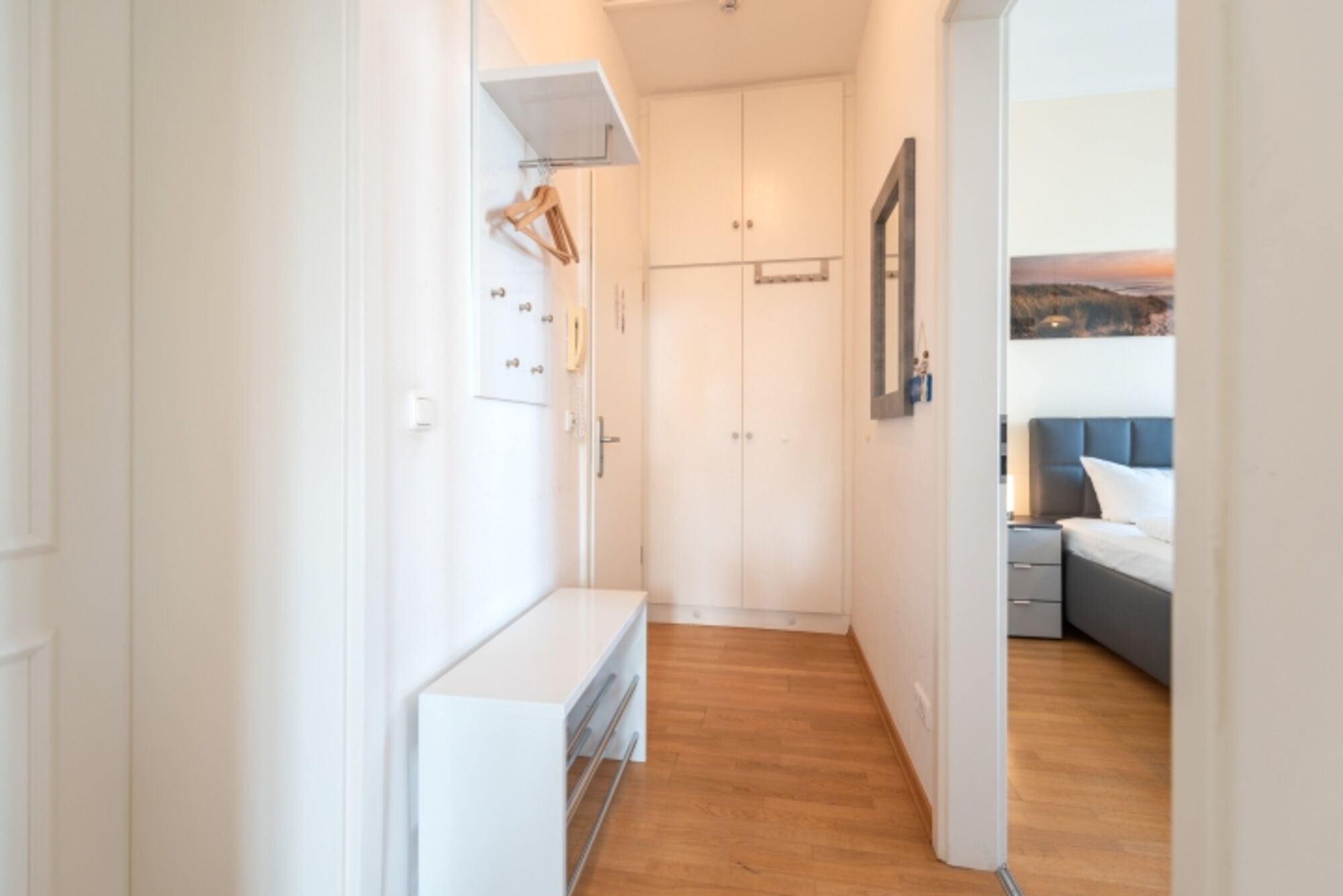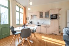 Das gemütliche Wohnzimmer mit offenem Erker – mit Meerblick aus der 2. Reihe – bietet eine bequeme Schlafcouch für die 3. und 4. Person sowie Zugang zu zwei Balkonen. Diese geben einen tollen, seitlichen Blick auf die Ostsee frei – perfekt, um die Meeresbrise zu genießen. Die vollständig ausgestattete Küchenzeile mit Essbereich lädt zu gemeinsamen Mahlzeiten ein. Das Schlafzimmer verfügt über ein komfortables Doppelbett, während das moderne Duschbad mit WC zusätzlichen Komfort bietet.