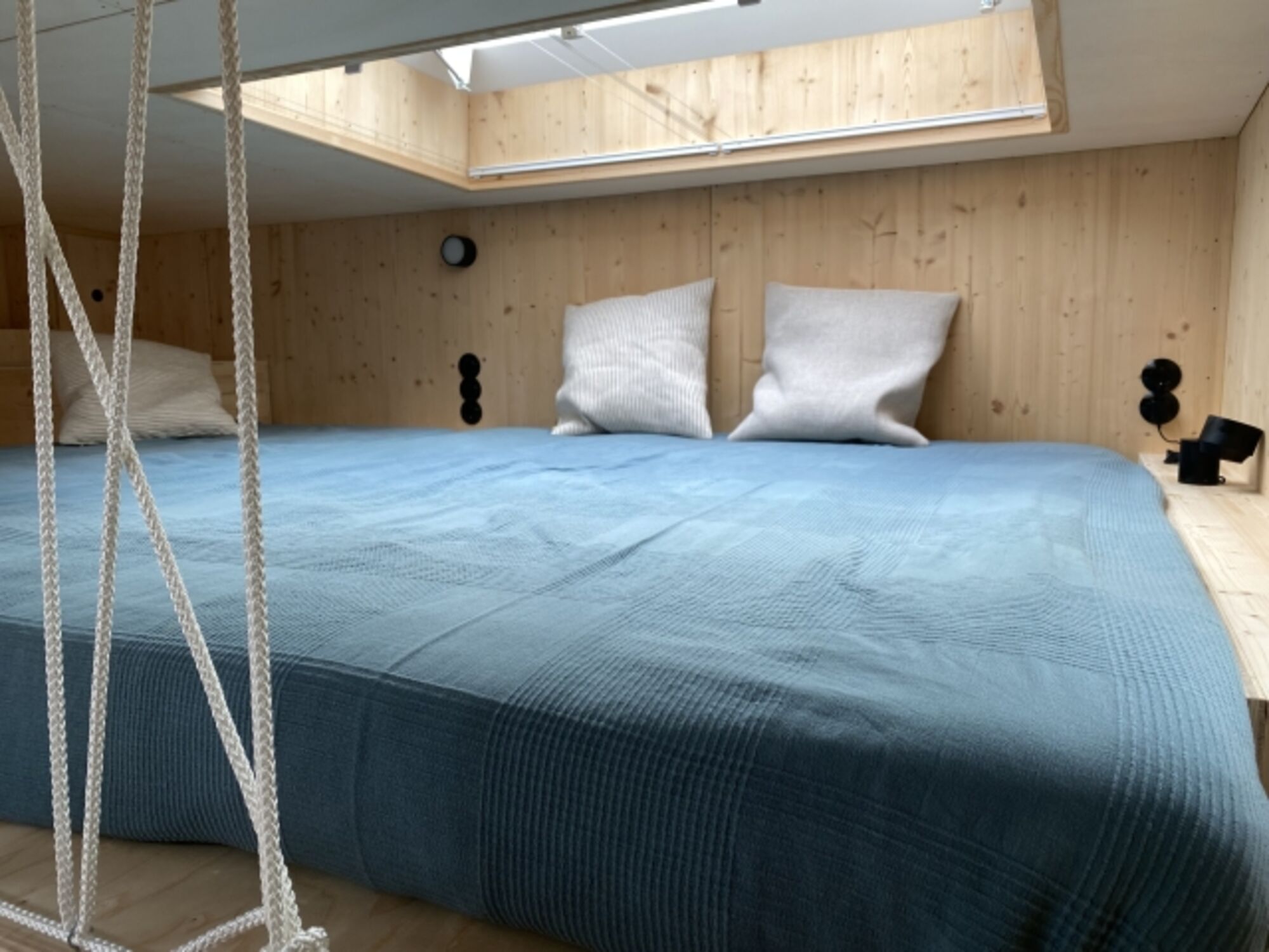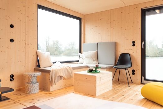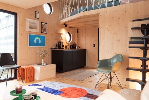 Das verbreiterte Tiny-Hausboot OFF wurde im Hausboot Hafen Hamburg nach ökologischen Maßstäben gebaut. Mit einer Breite von fünf statt vier Metern bietet es deutlich mehr Platz im Innenraum als unsere anderen Tiny-Hausboote. Auf 23 Quadratmetern Wohnfläche unten und 7 Quadratmetern Schlafebene oben werdet ihr euch wohlfühlen. Es gibt ein Bad mit Wassertoilette und Dusche, eine gut ausgestattete Küchenzeile, eine gemütliche Sofaecke mit tollem Ausblick und einen Tisch am Panoramafenster. Das Bett ist 1,80 m breit, zusätzlich gibt es eine kleinere Matratze auf der Schlafebene, super geeignet für Kinder. Die Sofaecke lässt sich zu einem 1,20 m breiten Schlafbereich umbauen. Vorne am Hausboot schließt sich draußen eine schöne Terrasse an, von wo aus eine Leiter auf die 18 Quadratmeter große Dachterrasse führt.