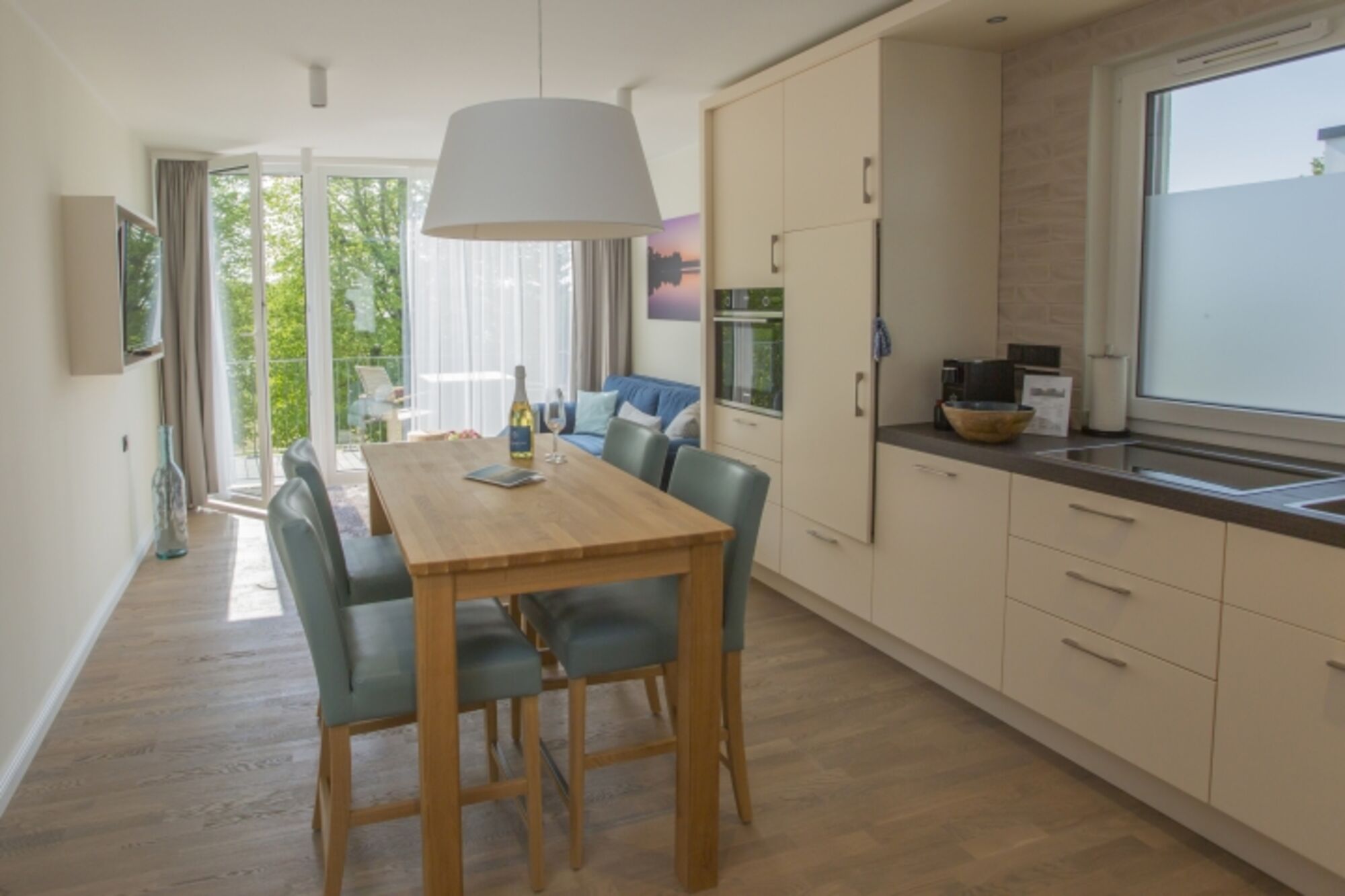 Cerankochfeld, Induktionsherd, Kühlschrank mit Gefrierfach, Gefrierschrank, Kaffeevollautomat, Küchenmaschine, Korkenzieher / Flaschenöffner, Geschirrhandtücher, Mülltüten, Essplatz in der Küche, TV in der Küche