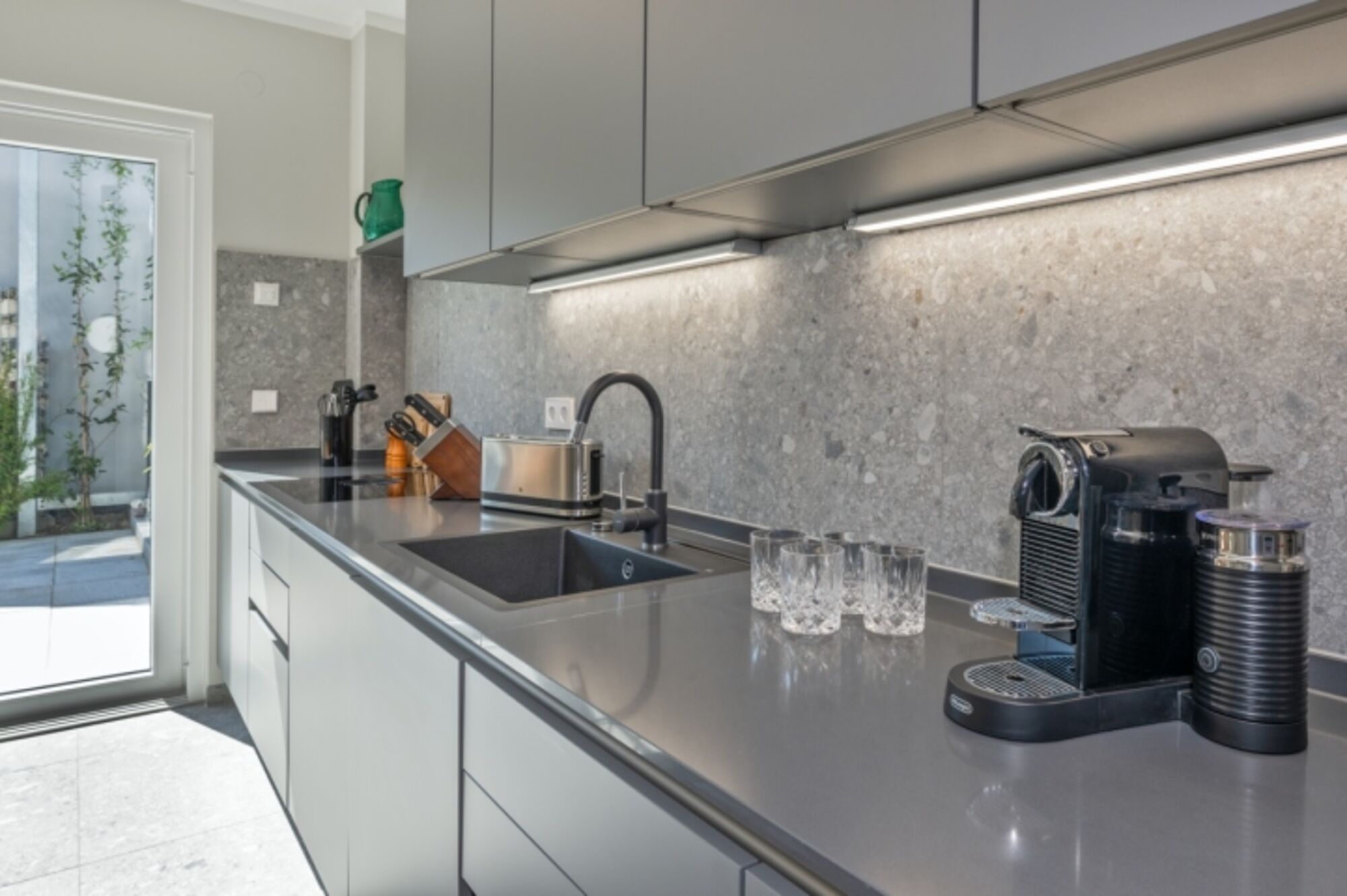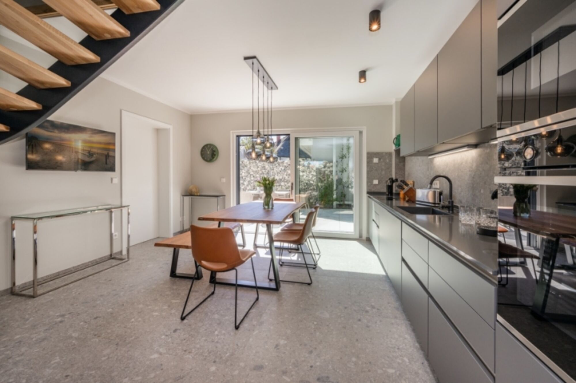 4-Platten Herd, Induktionsherd, Dunstabzugshaube, Kühlschrank mit Gefrierfach, Gefrierschrank, Nespresso-Automat, Mixer, Korkenzieher / Flaschenöffner, Gewürze (Salz, Pfeffer, Zucker), Geschirrhandtücher, Essplatz in der Küche, TV in der Küche