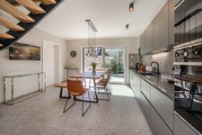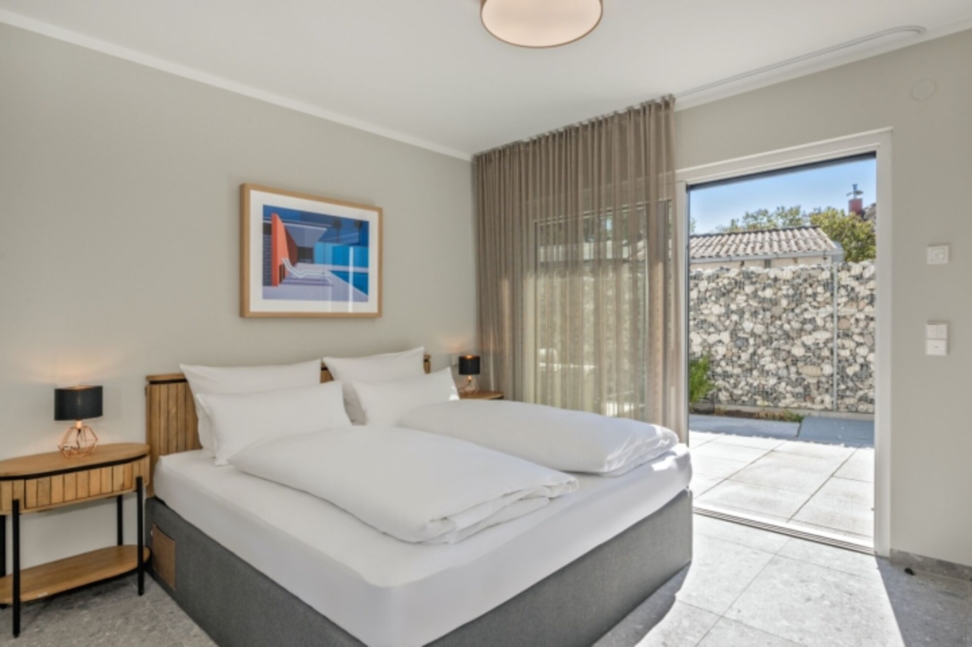Kinderreisebetten können auf Anfrage aufgestellt werden Im Erdgeschoss befindet sich ein erstes lichtdurchflutetes Schlafzimmer mit Doppelbett, geräumigen Kleiderschrank, Nachttischen und einem Flachbild-TV. Von hier aus können Sie direkt auf die Terrasse gelangen. Zudem befindet sich hier ein angrenzendes Bad mit Badewanne, Dusche und separatem WC. Doppelbett 1,80 x 2,00m
