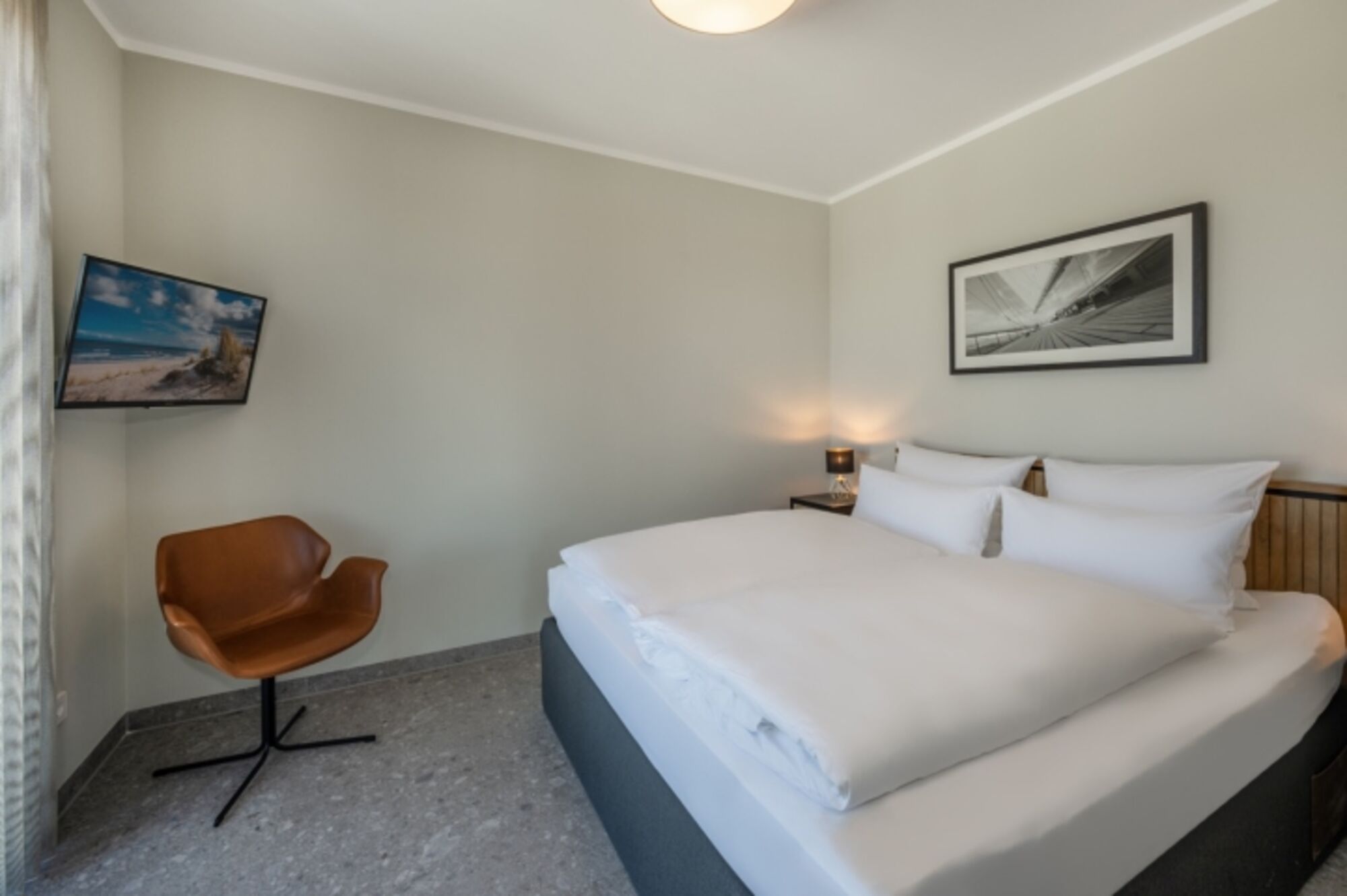 Schlafzimmer mit Blick aufs Meer Das Schlafzimmer verfügt über ein Doppelbett (1,80m) für zwei Personen mit Blick aufs Meer sowie einen Flachbild-TV und einen großen Balkon mit Tisch und Stühlen. Genießen Sie von hier aus romantische Sonnenuntergänge am Abend mit einmaligem Ausblick auf den Greifswalder Bodden bis zur Insel Rügen. Doppelbett 1,80 x 2,00m, Spiegel, Leselampe am Bett