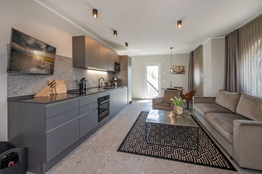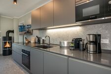 Induktionsherd, Dunstabzugshaube, Kühlschrank mit Gefrierfach, Nespresso-Automat, Mixer, Korkenzieher / Flaschenöffner, Gewürze (Salz, Pfeffer, Zucker), Geschirrhandtücher, Essplatz in der Küche, TV in der Küche