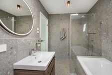 Das Penthouse verfügt über ein modernes Vollbad mit Dachfenster, einer Badewanne, einer Dusche, einem Waschtisch, WC, einem Föhn sowie eine hochwertige Regendusche, die für Wohlfühl-Atmosphäre sorgt. Waschbecken, Regendusche, Spiegel, Fenster im Bad