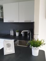 Induktionsherd, Gasofen / Gasherd, Kühlschrank mit Gefrierfach, Gefrierschrank, Korkenzieher / Flaschenöffner, Gewürze (Salz, Pfeffer, Zucker), Essplatz in der Küche