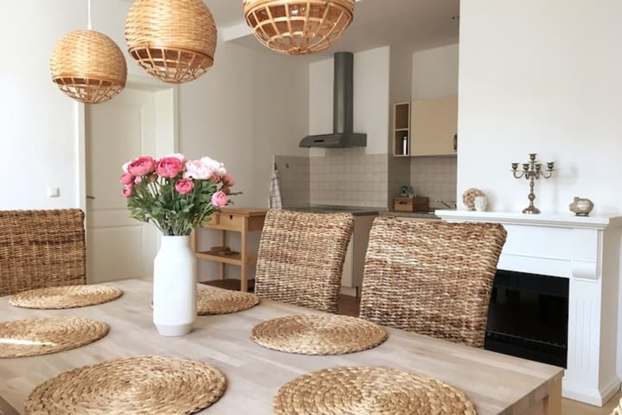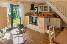 Den Mittelpunkt des Apartments stellt der gemütliche Wohn-und Essbereich mit offener Küche und Kamin dar.