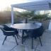 Neben den überdachten Loungemöbeln befindet sich eine weitere Tisch-Sitzgruppe im Freien.