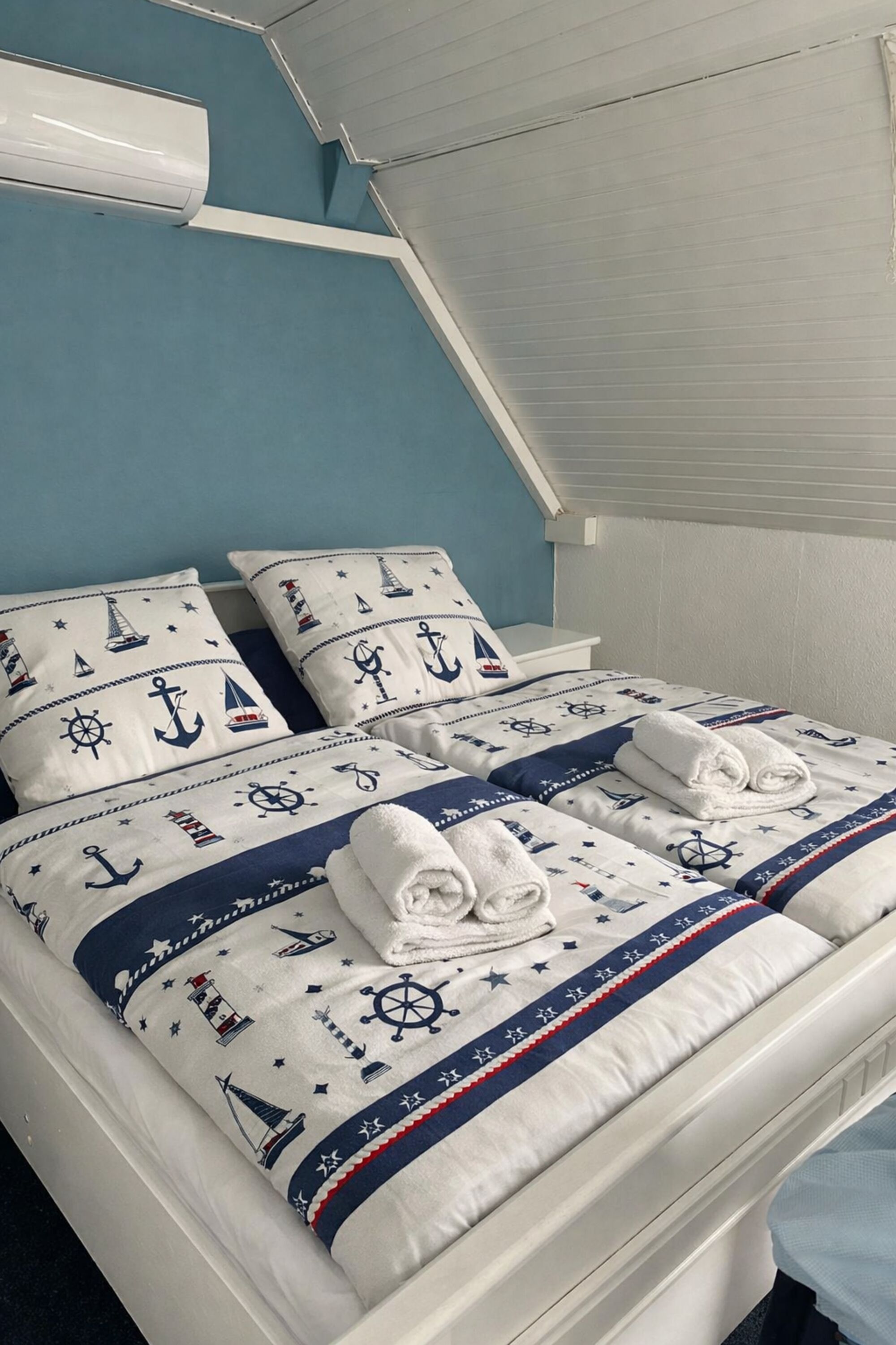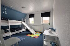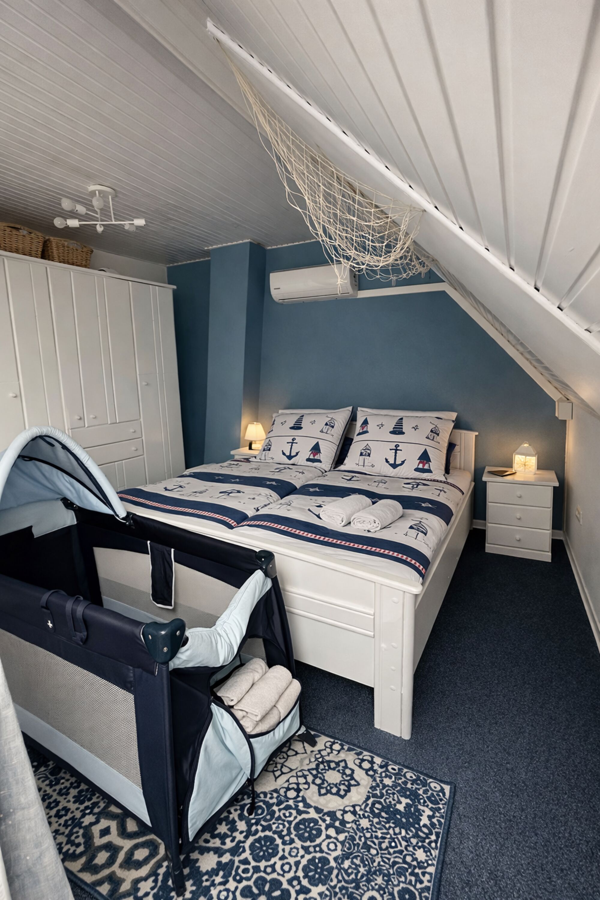 Im Obergeschoss befinden sich 3 liebevoll eingerichtete Schlafzimmer. Es gibt ein Schlafzimmer mit Doppelbett, Kinderreisebett, Wickelkommode und Smart-TV, ein Schlafzimmer mit zwei Einzelbetten und ein Schlafzimmer mit einem Doppeletagenbett und Rutsche. Das "Elternschlafzimmer" sowie das Wohnzimmer ist zudem mit einer Klimaanlage ausgerüstet. Einzelbett, Leselampe am Bett