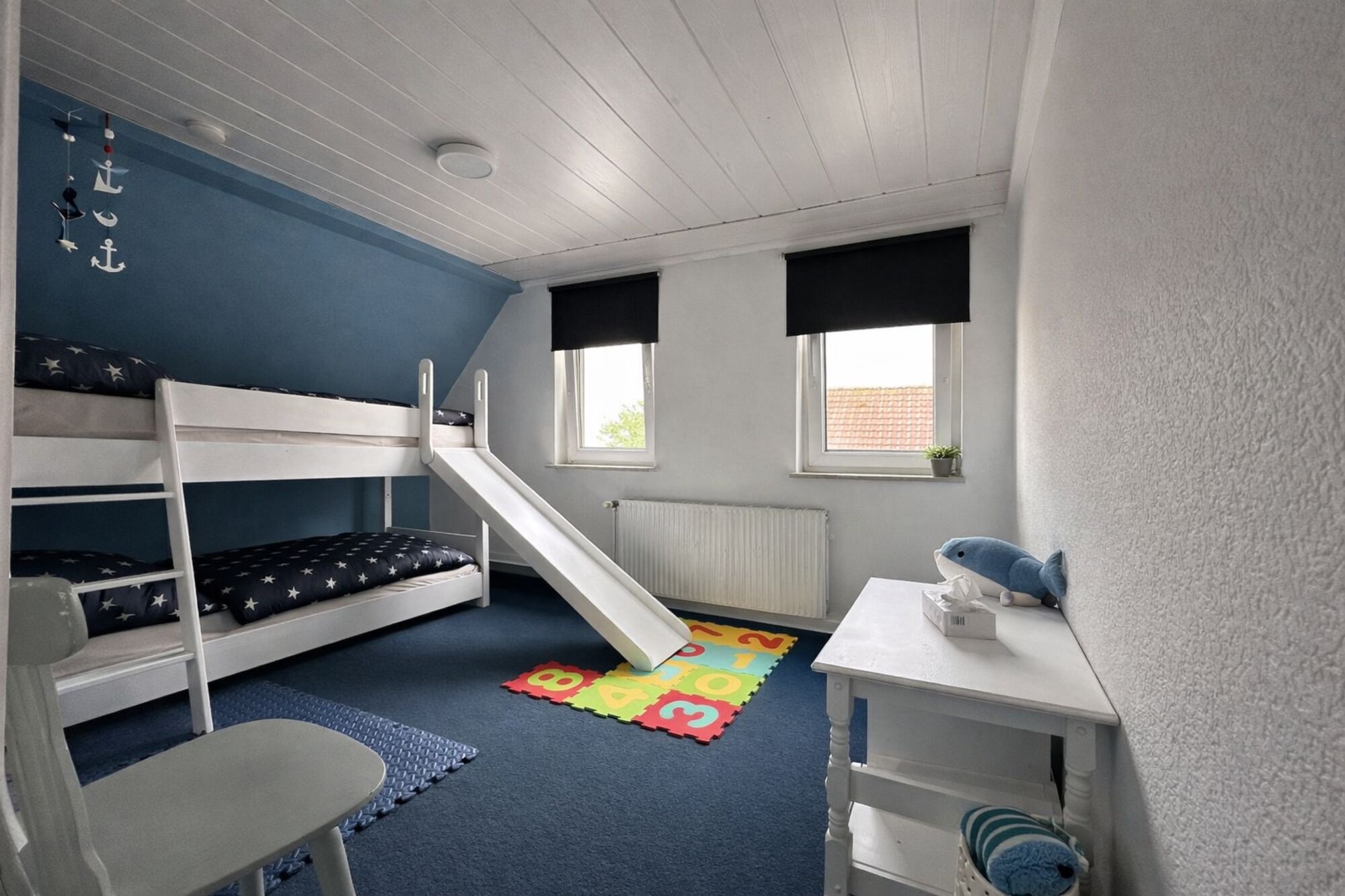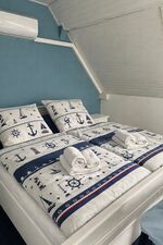 Im Obergeschoss befinden sich 3 liebevoll eingerichtete Schlafzimmer. Es gibt ein Schlafzimmer mit Doppelbett, Kinderreisebett, Wickelkommode und Smart-TV, ein Schlafzimmer mit zwei Einzelbetten und ein Schlafzimmer mit einem Doppeletagenbett und Rutsche. Das "Elternschlafzimmer" sowie das Wohnzimmer ist zudem mit einer Klimaanlage ausgerüstet.