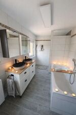 Badezimmer: WC, Badewanne, Dusche, Doppelwaschbecken, beleuchteter Spiegelschrank, 2 Fenster