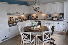 Küche : Essbereich mit Tisch, 6 Stühlen und einem Kinderhochstuhl, Geschirr, Spülmaschine, Herd, Backofen, Toaster, Kühl-Gefrierkombination, Mikrowelle, Wasserkocher, Kaffeemaschine, Waffeleisen, Sandwichmaker, Monsieur Cuisine, 2 höhenverstellbare Hundenäpfe