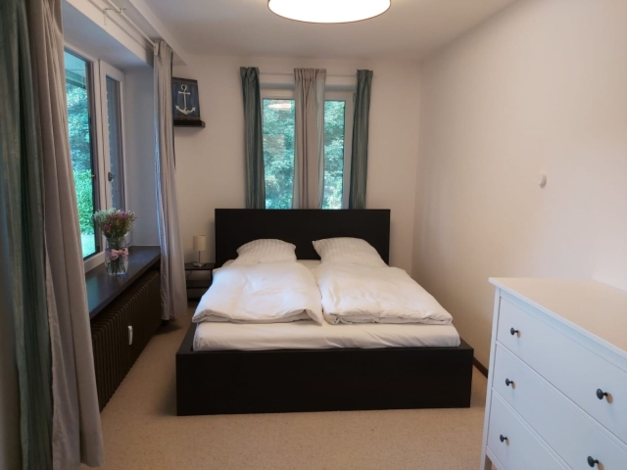 Doppelbett 1,60 x 2,00m, Kommode, Spiegel, Leselampe am Bett