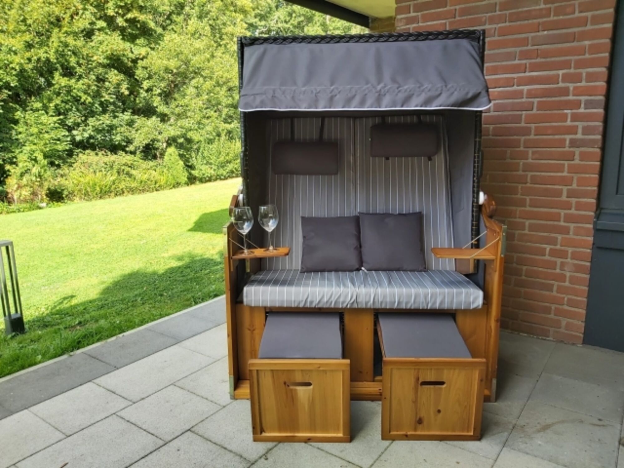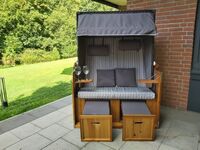 Im großen Garten, mit Gartenmöbeln und einem Strandkorb, können Sie grillen, sonnenbaden oder den Tag einfach ruhig ausklingen lassen.
