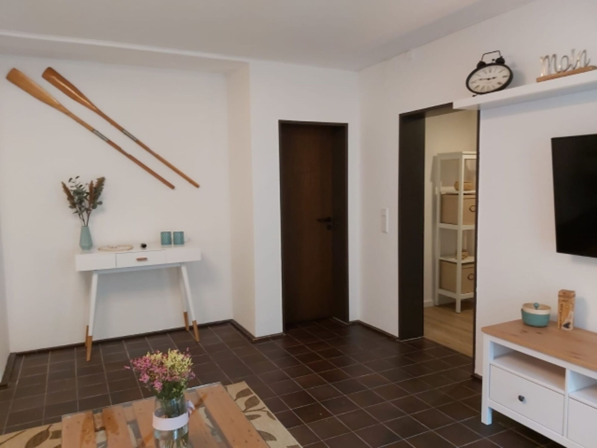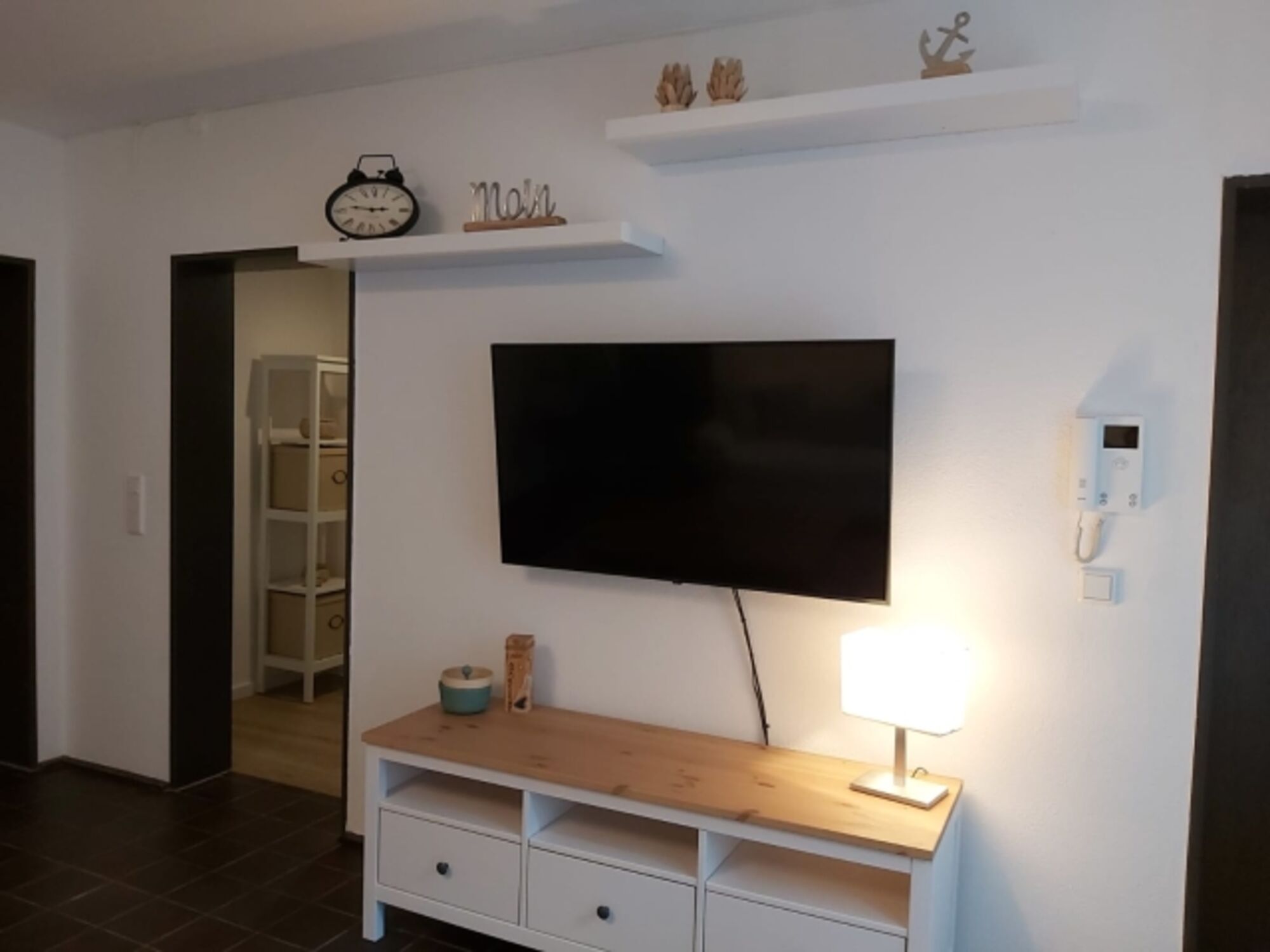 Die Förde Koje verfügt über zwei Schlafräume mit Doppelbett, ein Duschbad und einen großen gemütlichen Wohnbereich im nordischen Flair.