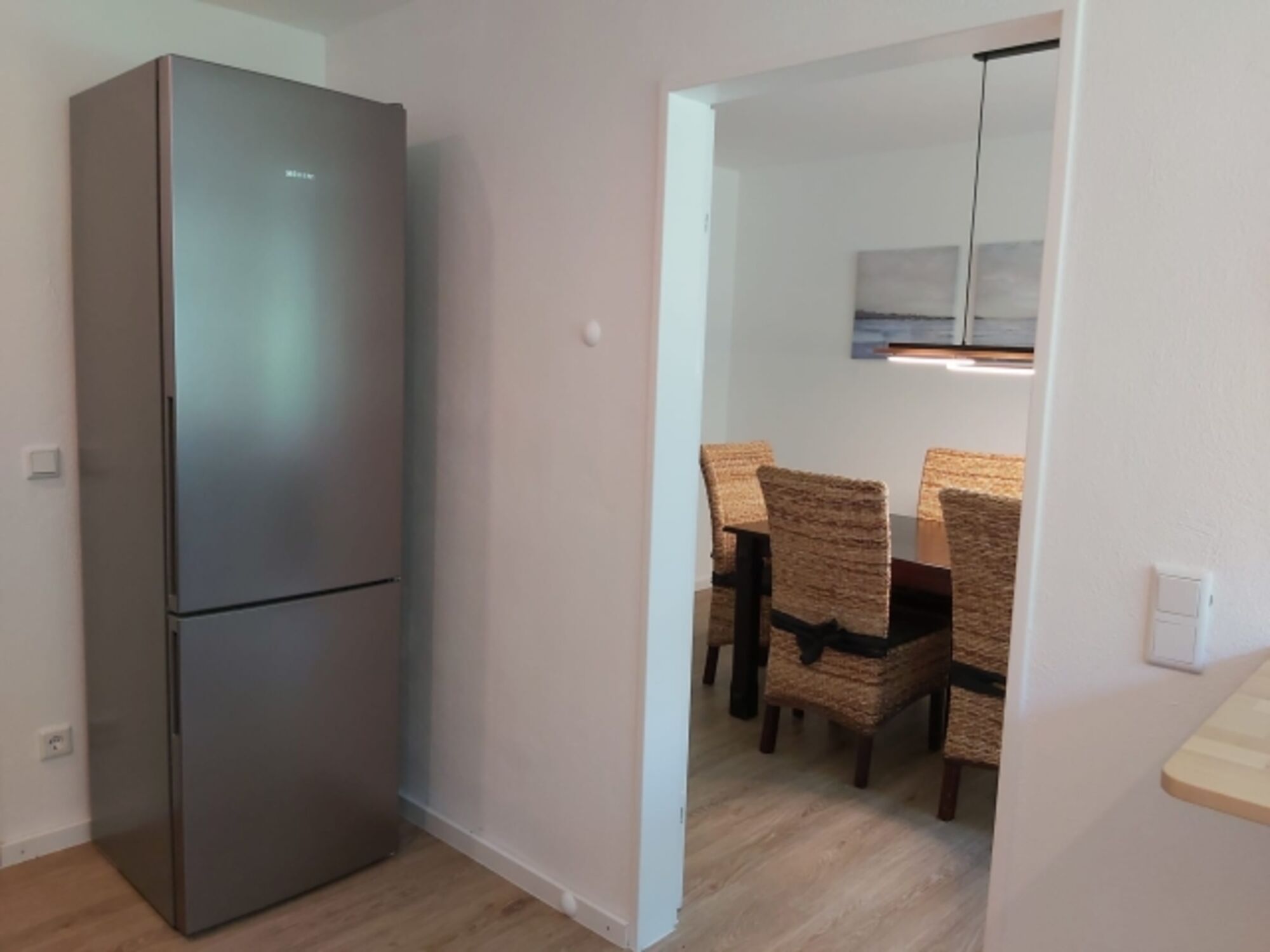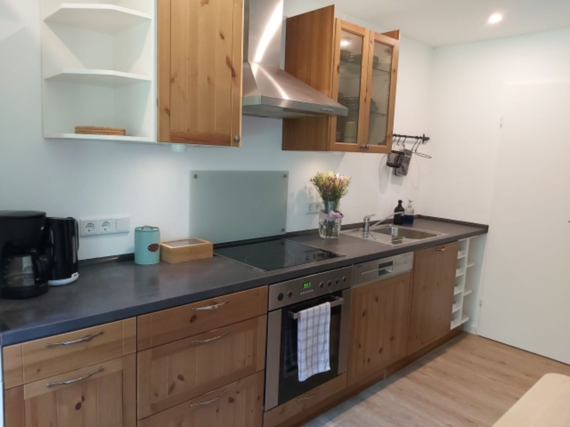4-Platten Herd, Cerankochfeld, Dunstabzugshaube, Kühlschrank mit Gefrierfach, Korkenzieher / Flaschenöffner, Geschirrhandtücher, Essplatz in der Küche