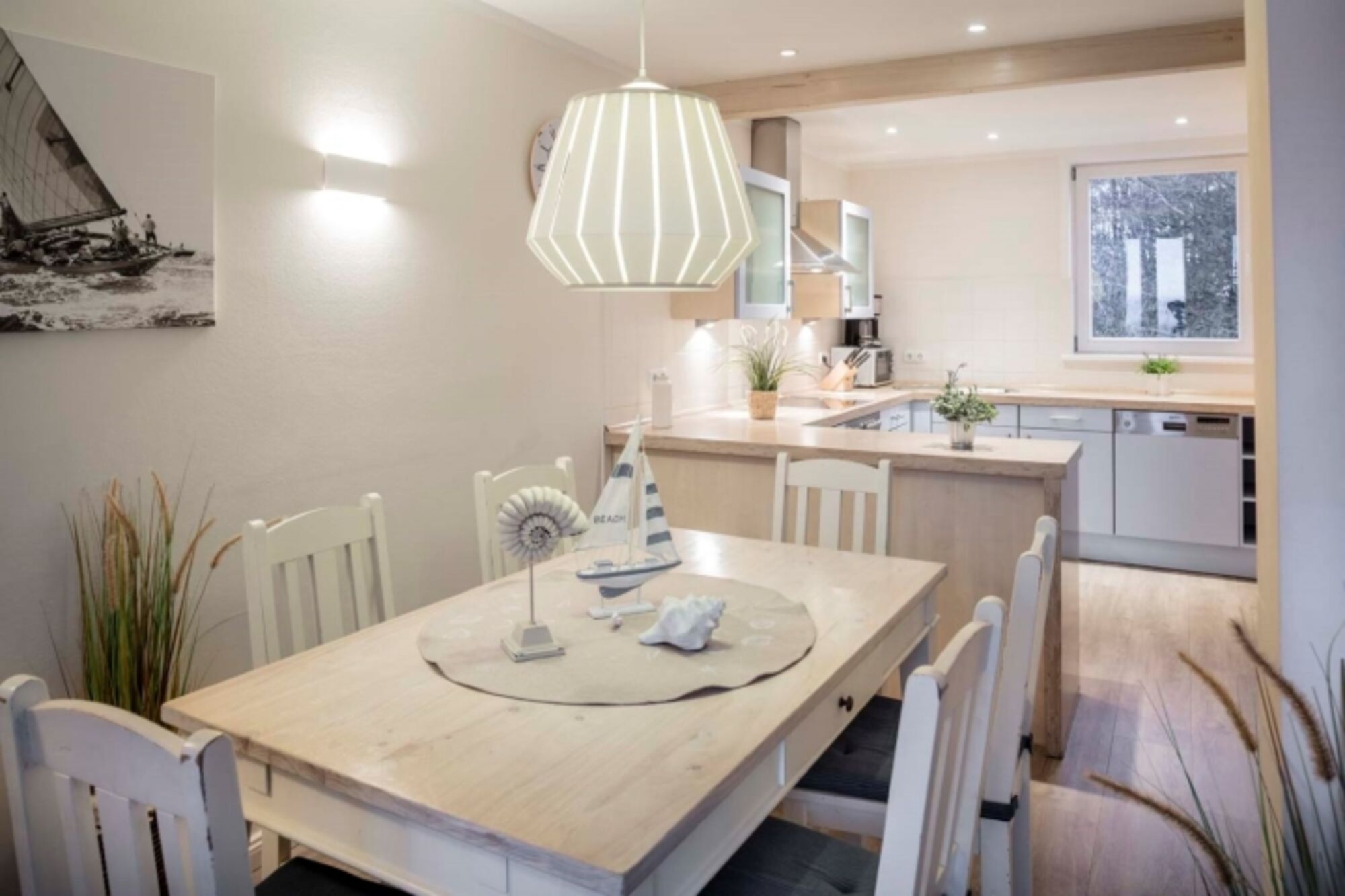 Auf zwei Wohnebenen spürst du im Strandhaus pure, ganz gelassene Ferienstimmung. Der Einrichtungsstil ist frisch und elegant: helles Weiß, warme Naturtöne, kombiniert mit stilvollen maritimen Schwarz-Weiß-Fotografien an den Wänden.