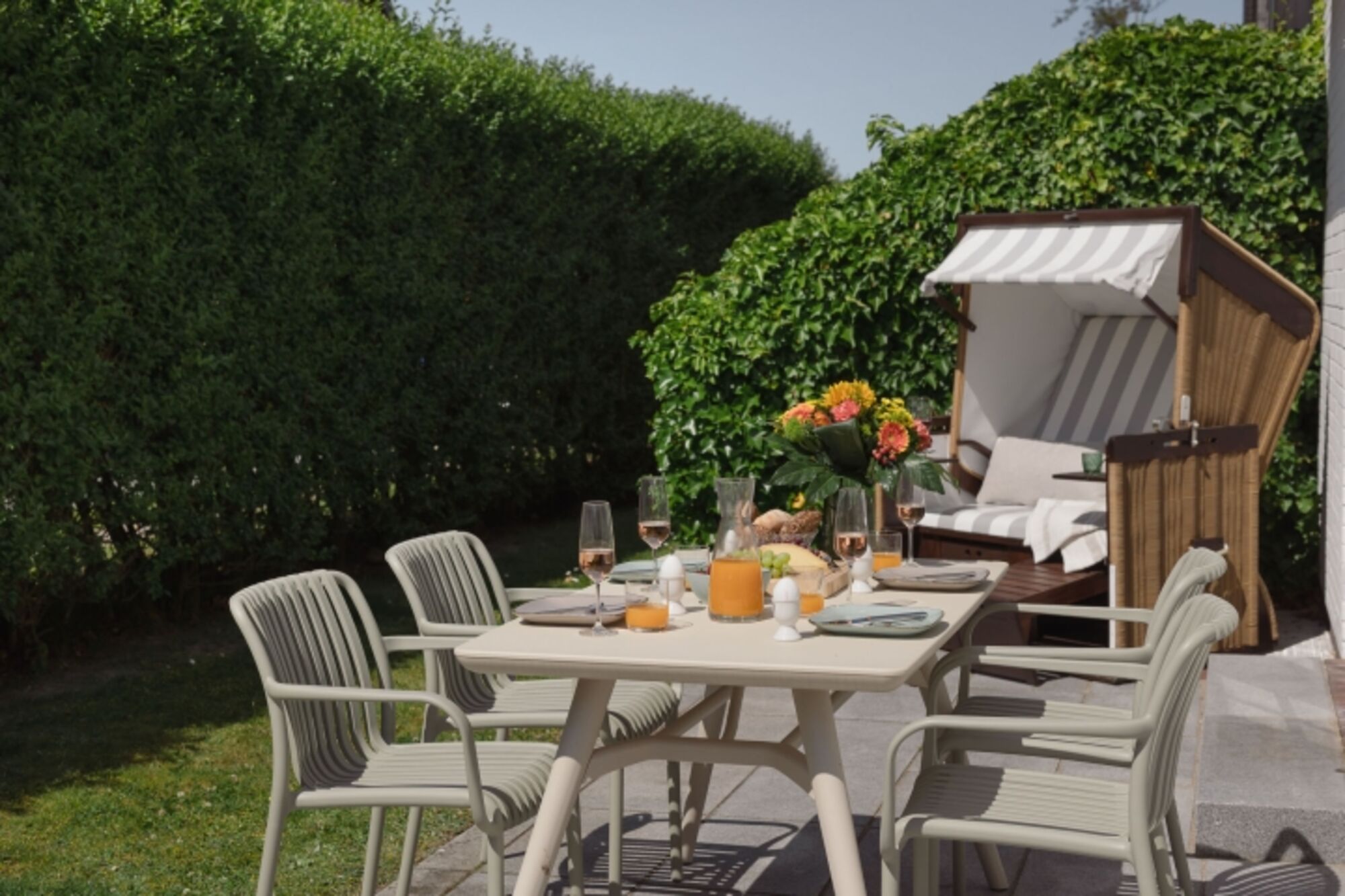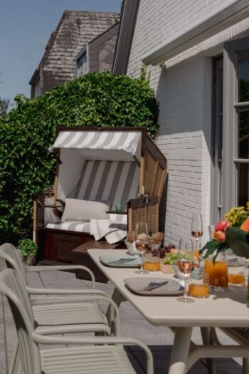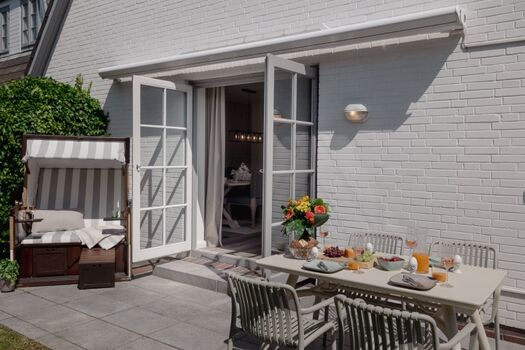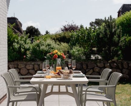 Die südwestlich ausgerichtete und mit Granitplatten ausgestattete Terrasse rundet die Ruheoase ab. Nutzen sie die Sonnen Plätze mit elektrischer Markise als Ihren Rückzugsort mit Gartenmöbeln und Strandkorb (saisonal). Genießen Sie den Garten mit Hund und entspannen Sie im „Baileys Hüs“. Für sie gibt es sogar einen speziellen "Hundeleineparkplatz".