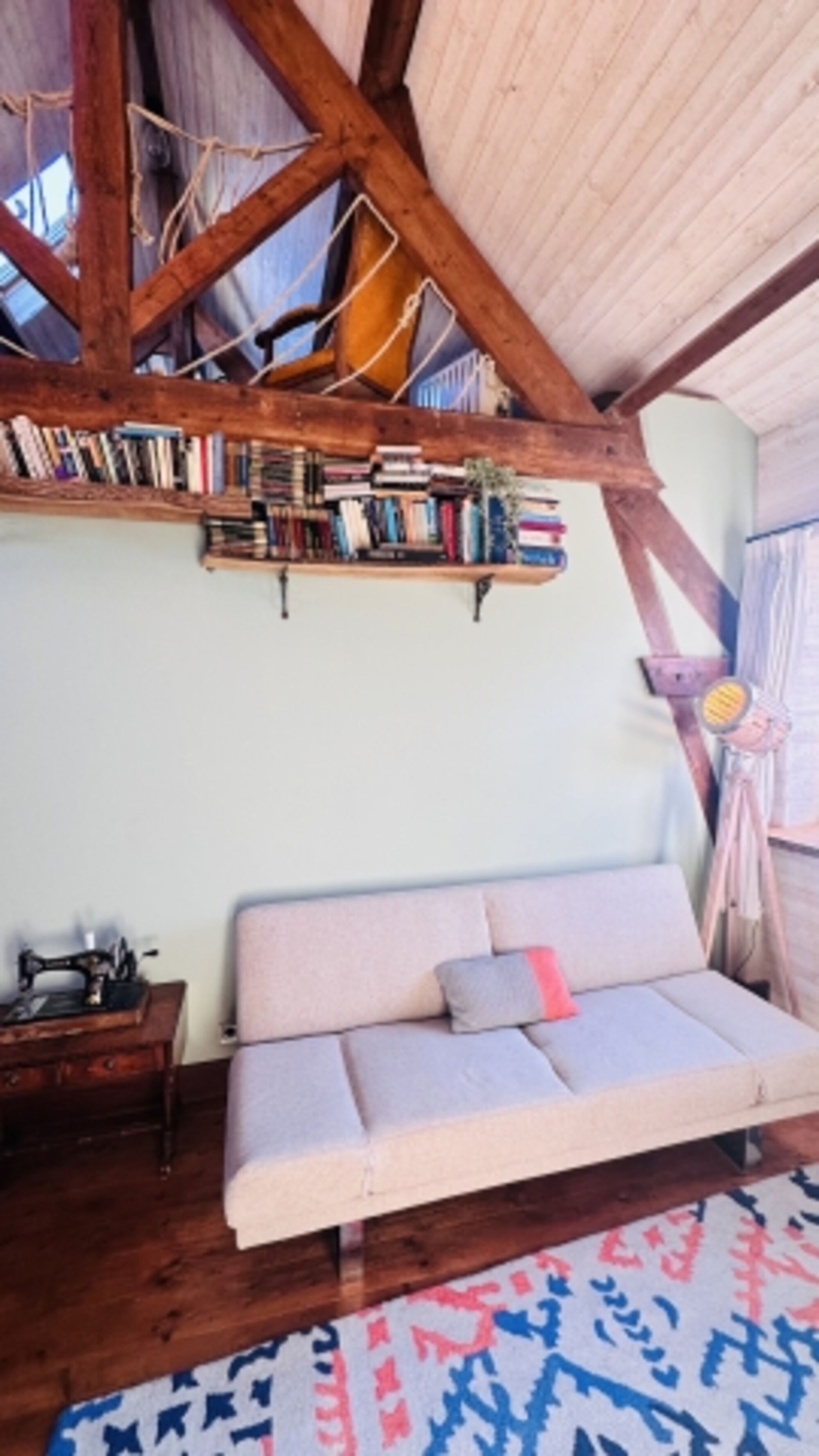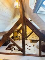 Wenn Sie die Treppe zum Zwischengeschoss hinaufsteigen, gelangen Sie zu einem schönen Schlafzimmer und einem Wohnbereich unter der Treppe. Bitte beachten Sie, dass kleine Kinder aufgrund der Stufen und des offenen Grundrisses nicht hierher gelassen werden sollten. Doppelbett 1,80 x 2,00m, Spiegel