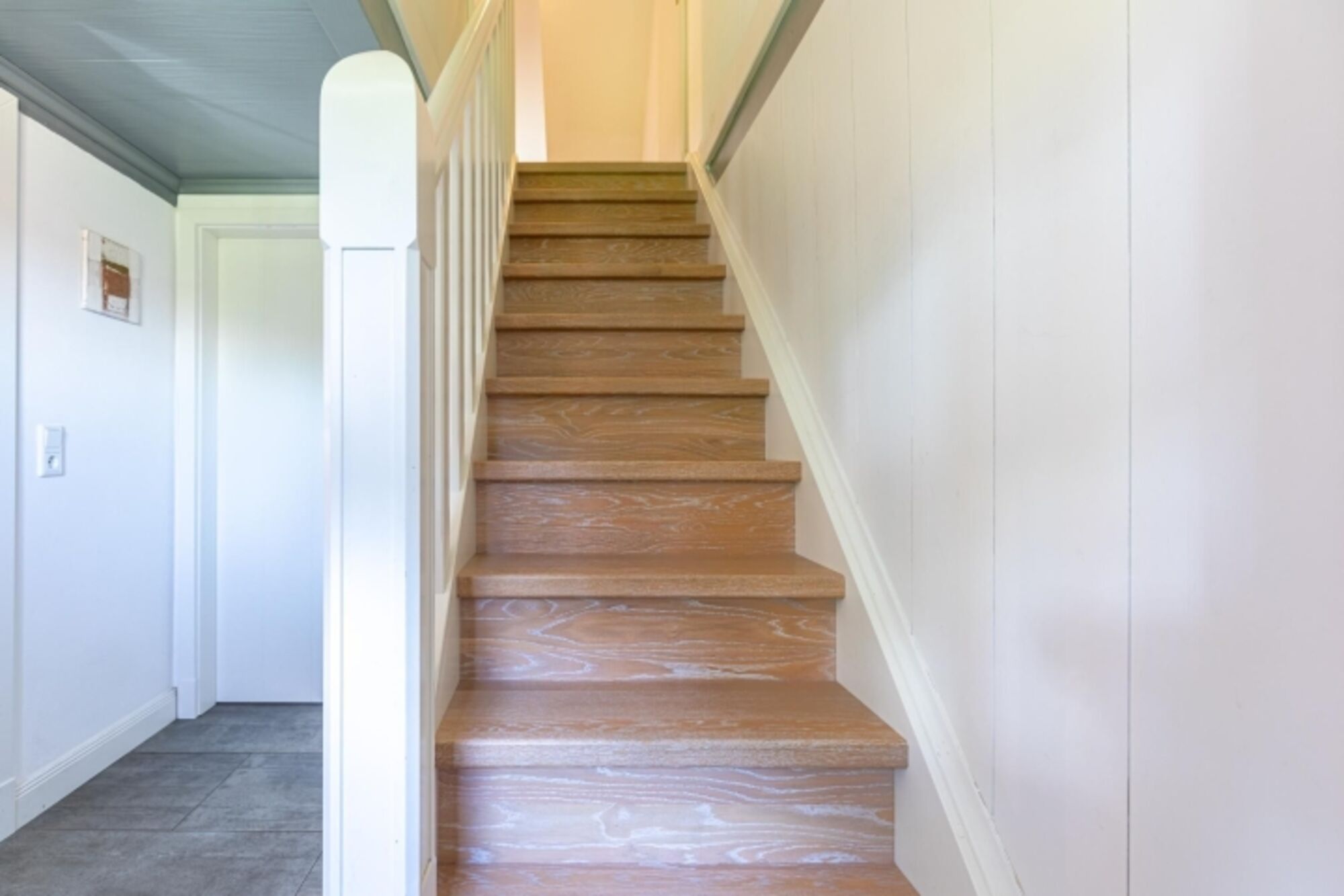 Das Ferienhaus verfügt über drei Schlafzimmer: eines im Erdgeschoss, die anderen beiden sind über eine Treppe im Obergeschoss erreichbar.