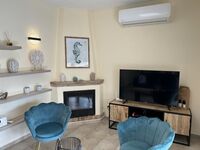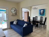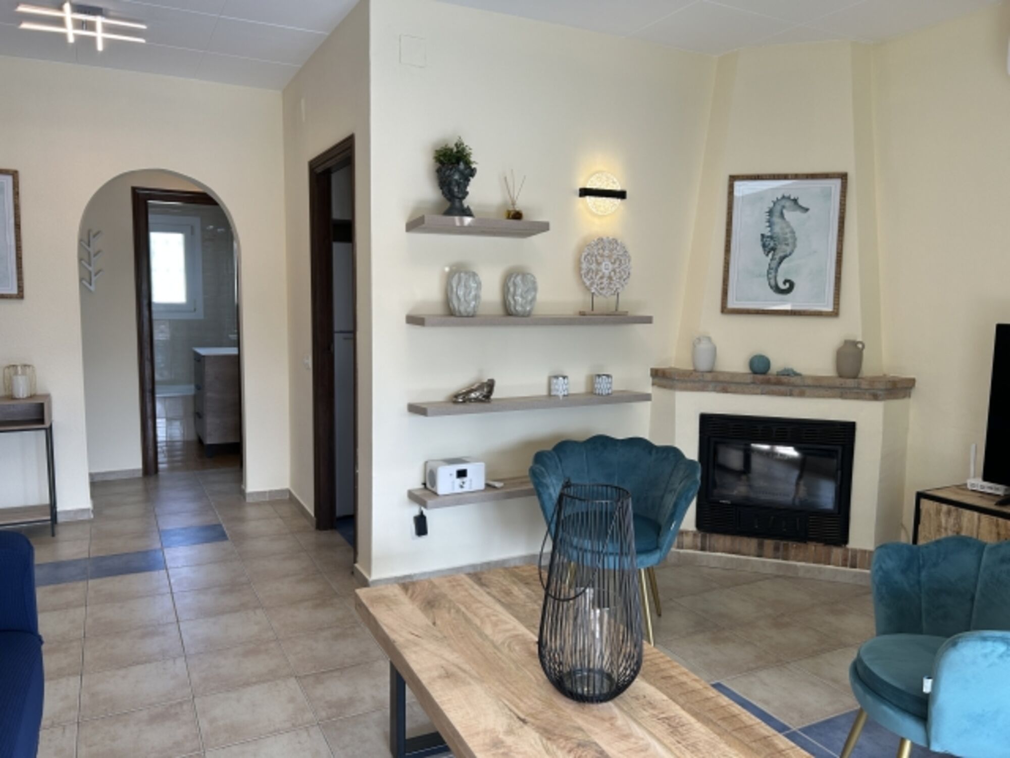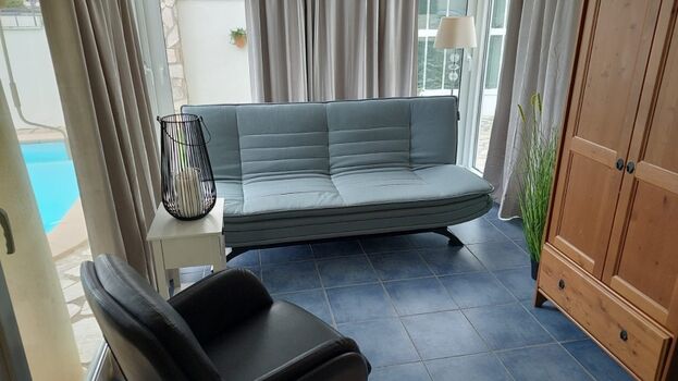 Im Haus befinden sich ein großes Wohn- und Esszimmer mit einem schönen Kamin und einer komplett ausgestatteten Einbauküche mit Ceranfeld, Backofen, Abzugshaube, Mikrowelle, Geschirrspüler und Kühlschrank. An den Wohn- und Essbereich angrenzend ist ein gemütlicher heller Wintergarten mit einem Schlafsofa mit Zugang zum Pool. Im Haus gibt es insgesamt 2 Schlafzimmer. Beide Schlafzimmer sind mit einem Doppelbett ausgestattet. Es gibt ein Badezimmer mit Badewanne sowie ein Badezimmer mit Dusche. Das Haus hat Sat-TV, ein Bluetooth-Radio und eine Klimaanlage