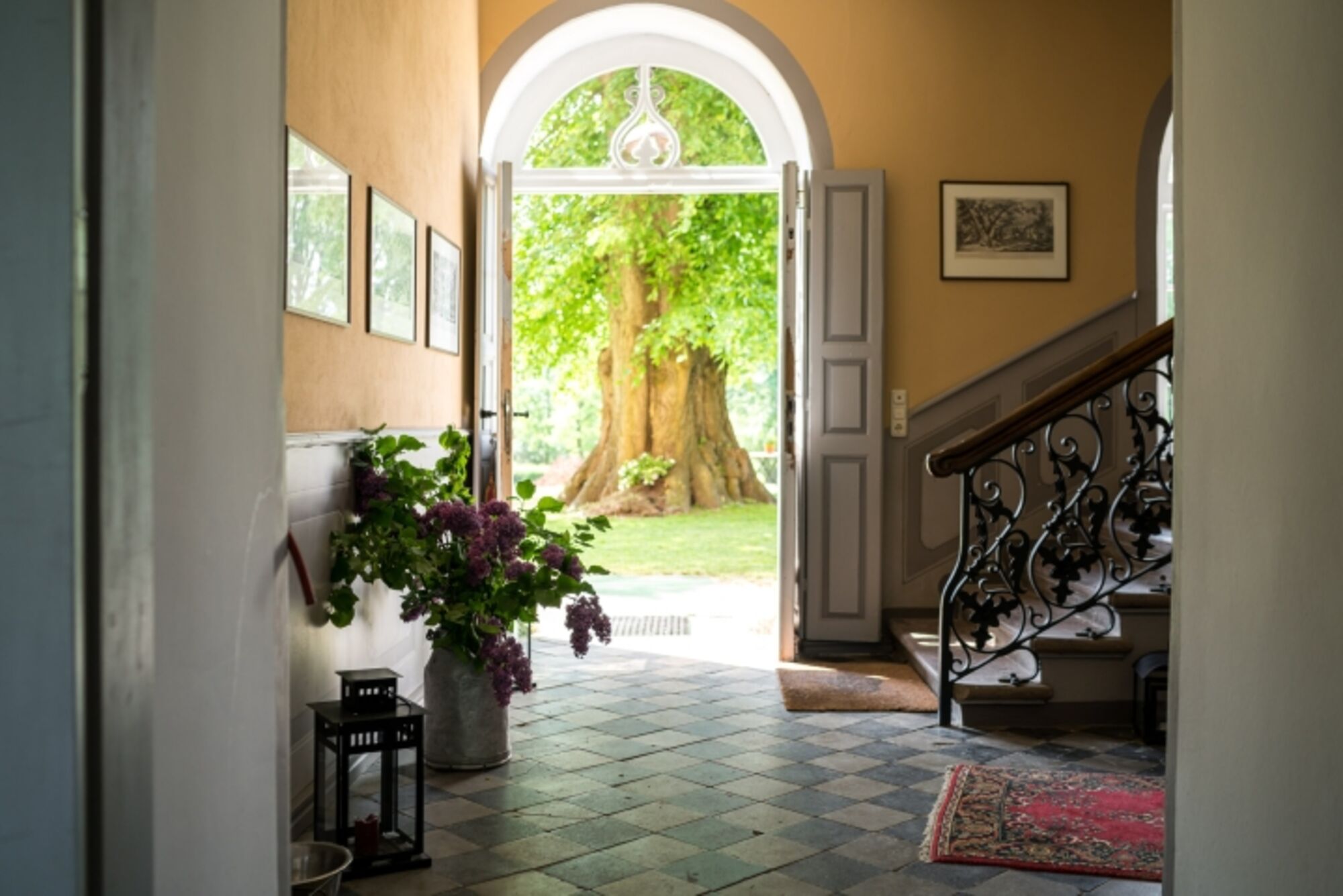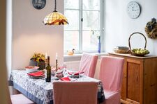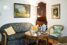 Die Ferienwohnung "Über den Linden" liegt im 2. OG des Haupthauses und ist über eine breite Treppe gut erreichbar. Der Ausblick geht in die westliche Lindenallee und erfreut Liebhaber der Abendsonne. Ins Wohnzimmer integriert ist eine Küchezeile und ein gemütlicher Essplatz. In der Wohnung dominieren antike Möbel mit Charme. Die beiden Schlafzimmer mit Doppelbett und zwei Einzelbetten liegen hintereinander und gehen vom Wohnzimmer ab, ebenso wie das Duschbad.