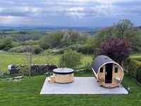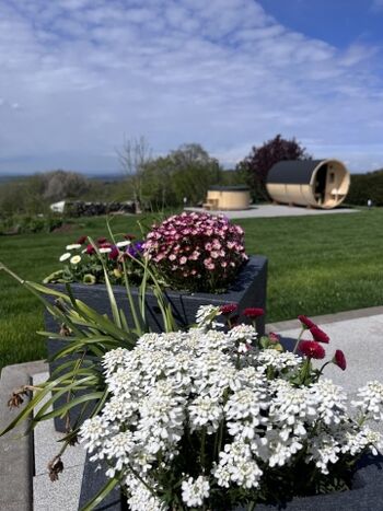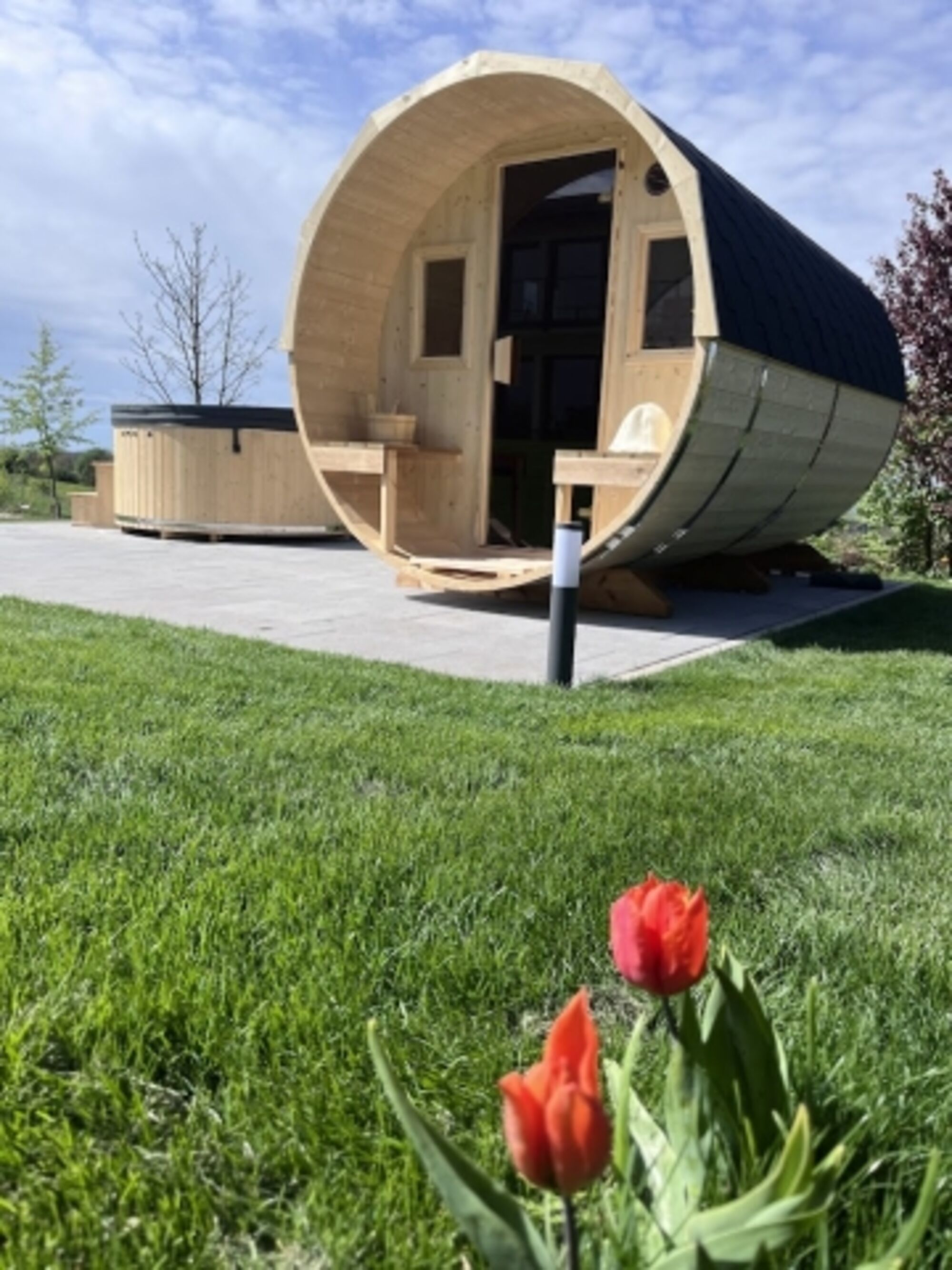 SPA: Panorama- / Fasssauna 3,5 m lang für 6 Personen. Mit Fernblick schwitzen. (ab 01.05.2025)