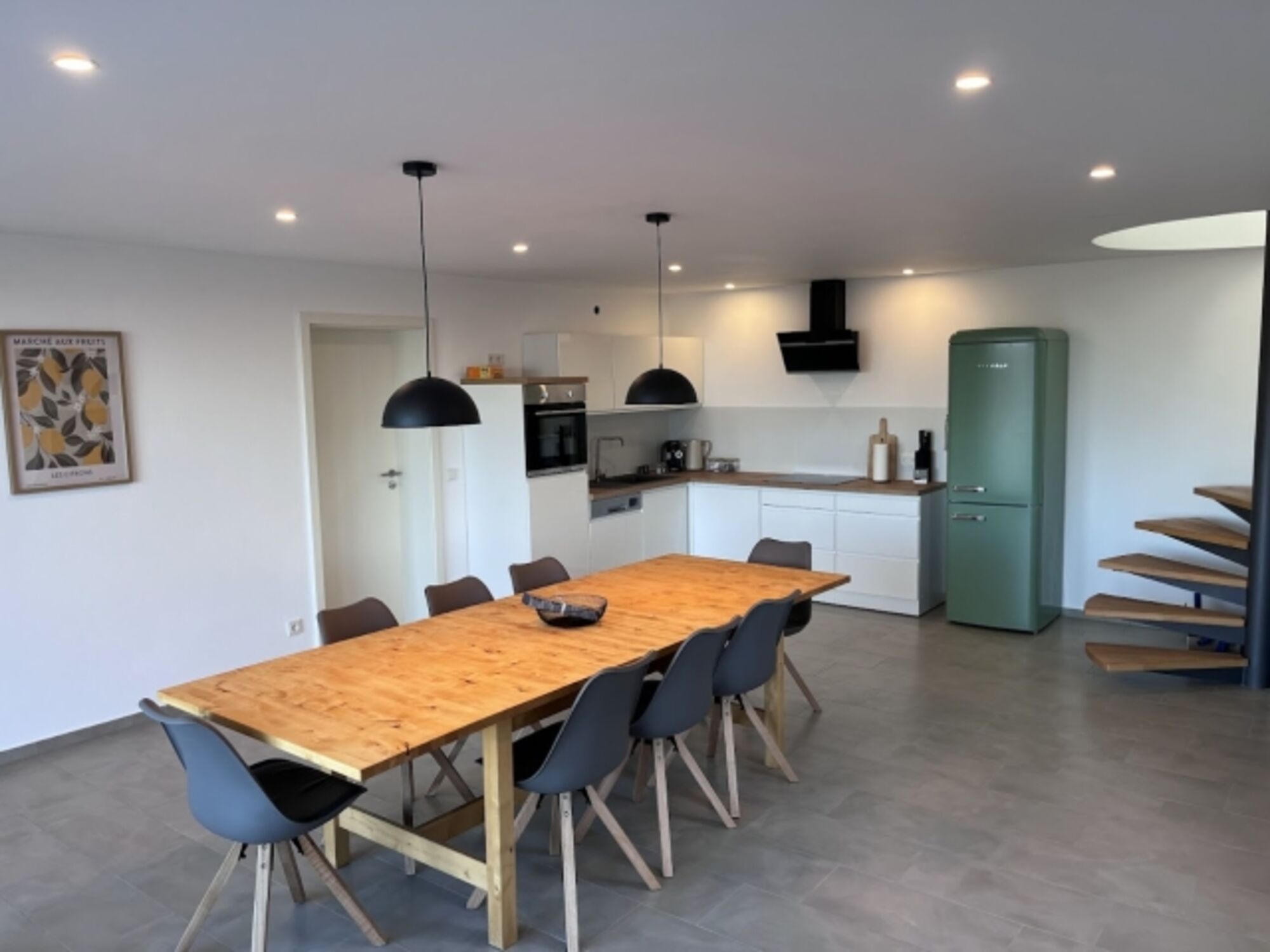 Esszimmer mit großzügig eingerichteter Küche und Terrasse